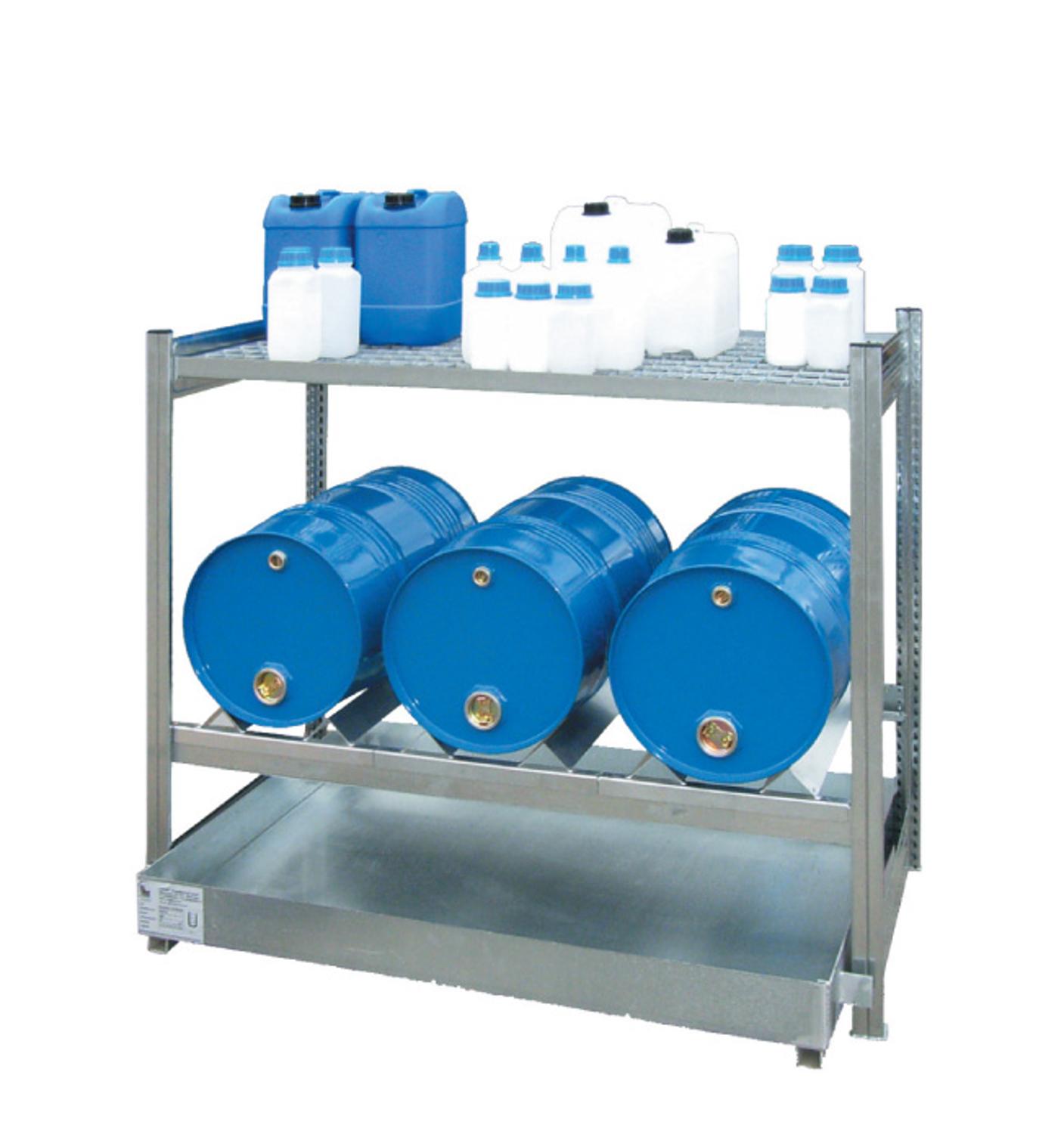 Voor de gezamelijke opslag van klein emballage en 60 liter vaten op 2 niveaus. Staal verzinkte aftapstelling met opvangbak. De opslagniveaus bestaan uit 1 roosterlegbord voor klein embalage en 1 opstelniveau standaard voorzien van vaste vatenliggers. Draagvermogen per liggerpaar is 200 kg en de stelling heeft een segmentlast van max. 600 kg. Hoge stabiliteit d.m.v. steekverbindigen. Basissegment eenvoudig uit te breiden met aanbouwsegmenten.