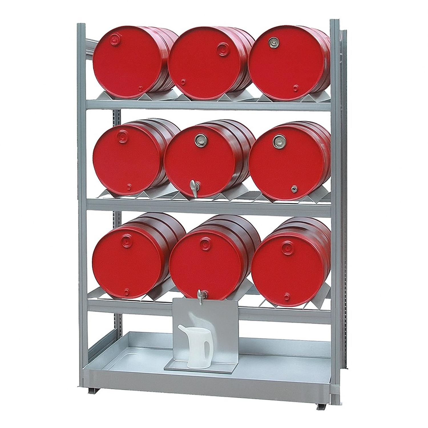 Voor de gezamelijke opslag van klein emballage en 60 liter vaten op 3 niveaus. Staal verzinkte aftapstelling met opvangbak. De aftapstelling bestaat uit 3 opstelniveaus welke standaard voorzien zijn van vaste vatenliggers. Draagvermogen per liggerpaar is 200 kg en de stelling heeft een segmentlast van max. 600 kg. Hoge stabiliteit d.m.v. steekverbindigen. Basissegment eenvoudig uit te breiden met aanbouwsegmenten.