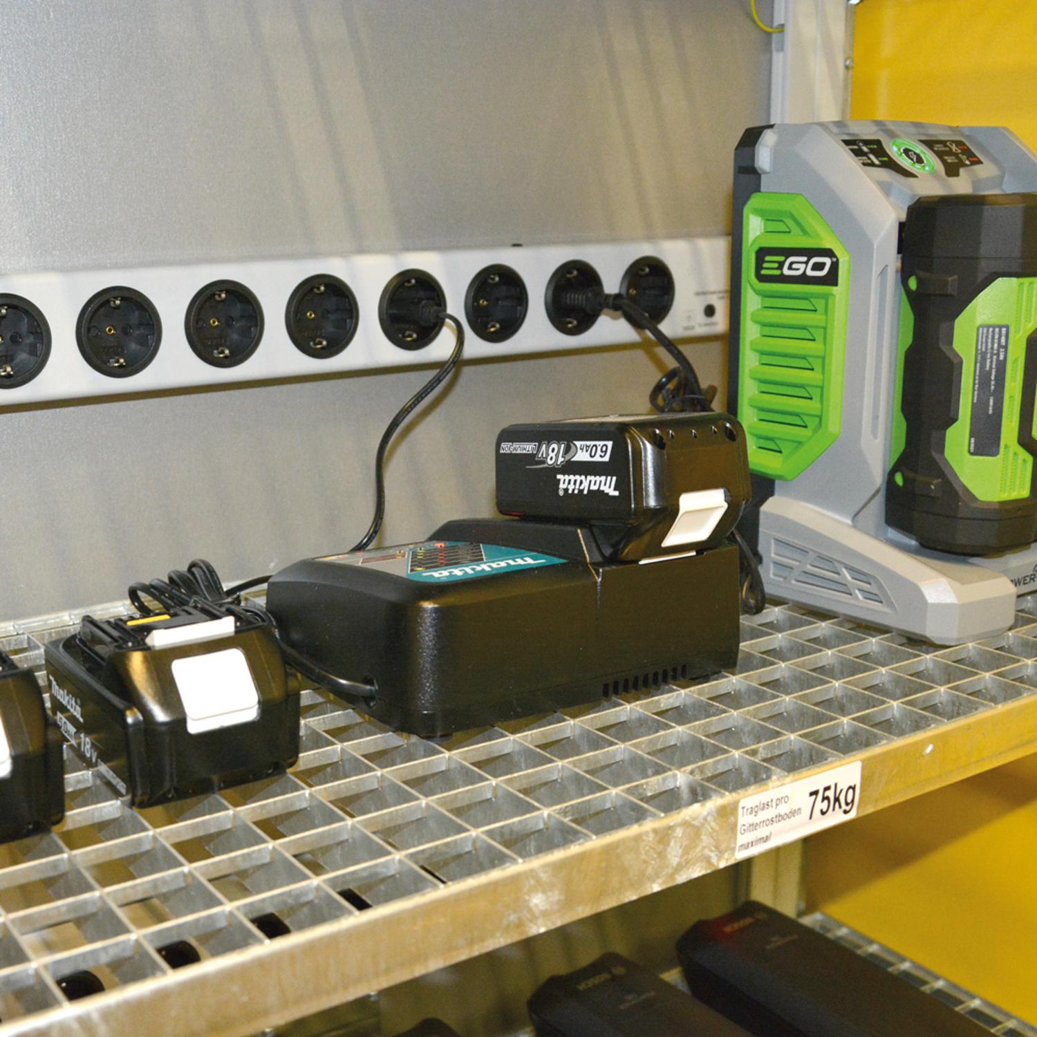 De kast is voorzien van vier in hoogte verstelbare legborden, elk met een draagvermogen van 75 kg. Hierdoor kunnen zowel kleine als grotere lithium batterijen veilig worden opgeslagen. De totale opslagcapaciteit bedraagt 8 kWh (maximaal 2 kWh per niveau), wat gelijkstaat aan 2-4 fietsaccu’s per niveau.