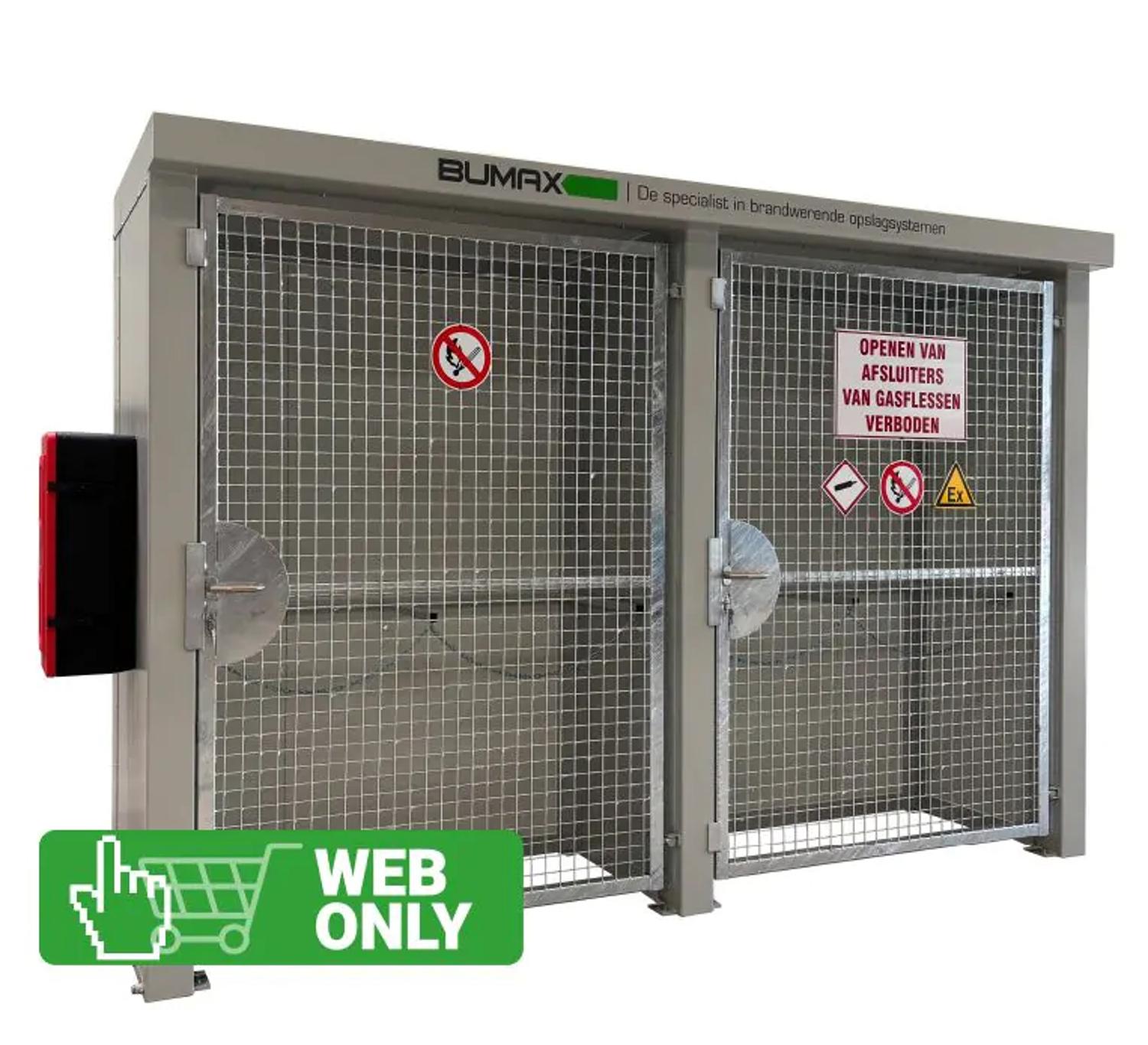 De brandwerende gasflessenberging BM 24-2 is geschikt voor uitpandige opslag van gevaarlijke stoffen volgens de PGS 15. De Bumax brandwerende gasopslag wordt volledig gemonteerd geleverd. Voor een goede werking van het opslagsysteem is het van belang dat deze wordt geplaatst op een vlakke waterpas ondergrond bijvoorbeeld stelconplaten of betonnen vloer.