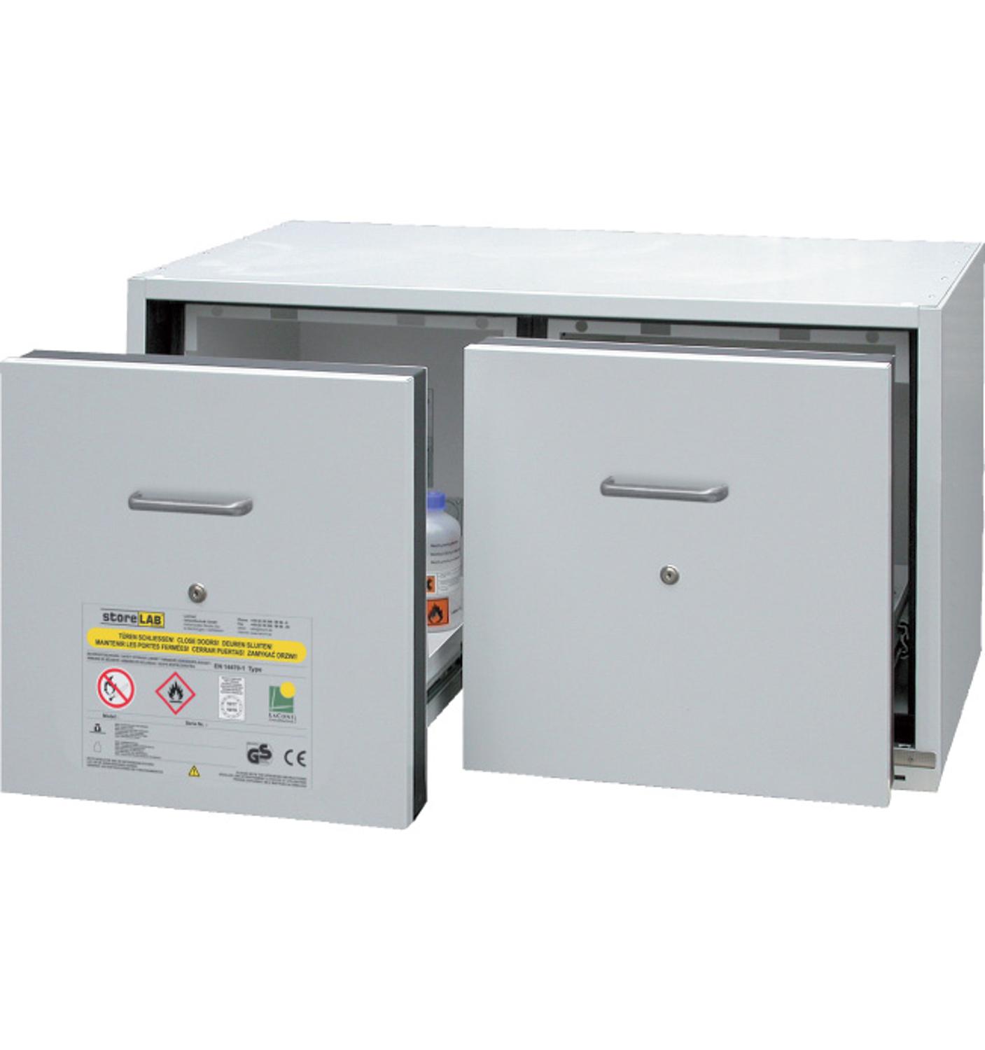 De brandwerende onderbouwkast met schuiflade AUS 90 / 1100-500 SF past perfect onder een werkbank of zuurkast. De onderbouwkast is speciaal ontwikkeld voor de opslag van gevaarlijke stoffen conform de PGS 15. Deze veiligheidskast heeft een breedtemaat van 1.100 mm en is uitgevoerd met een grote schuiflade. Met een brandwerendheid van 90 minuten en een productcertificaat volgens EN 14470-1 voldoet deze brandveilige onderbouwkast aan alle wettelijke normen.