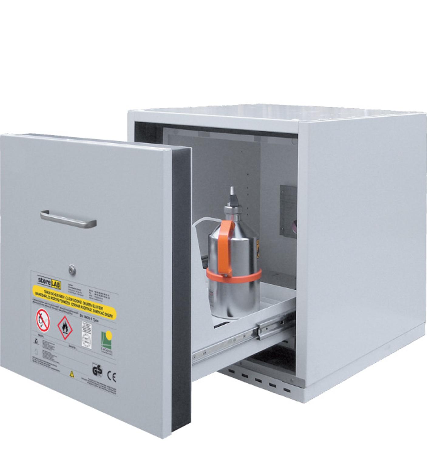 De brandwerende onderbouwkast AUS 90 / 600 SF is speciaal ontwikkeld voor de opslag van gevaarlijke stoffen conform de PGS 15. Deze veiligheidskast heeft een schuiflade en past perfect onder een werktafel of zuurkast; de juiste oplossing voor werkplekken met beperkte ruimte. Met een brandwerendheid van 90 minuten en een productcertificaat volgens EN 14470-1 voldoet deze brandveilige onderbouwkast aan alle wettelijke normen.