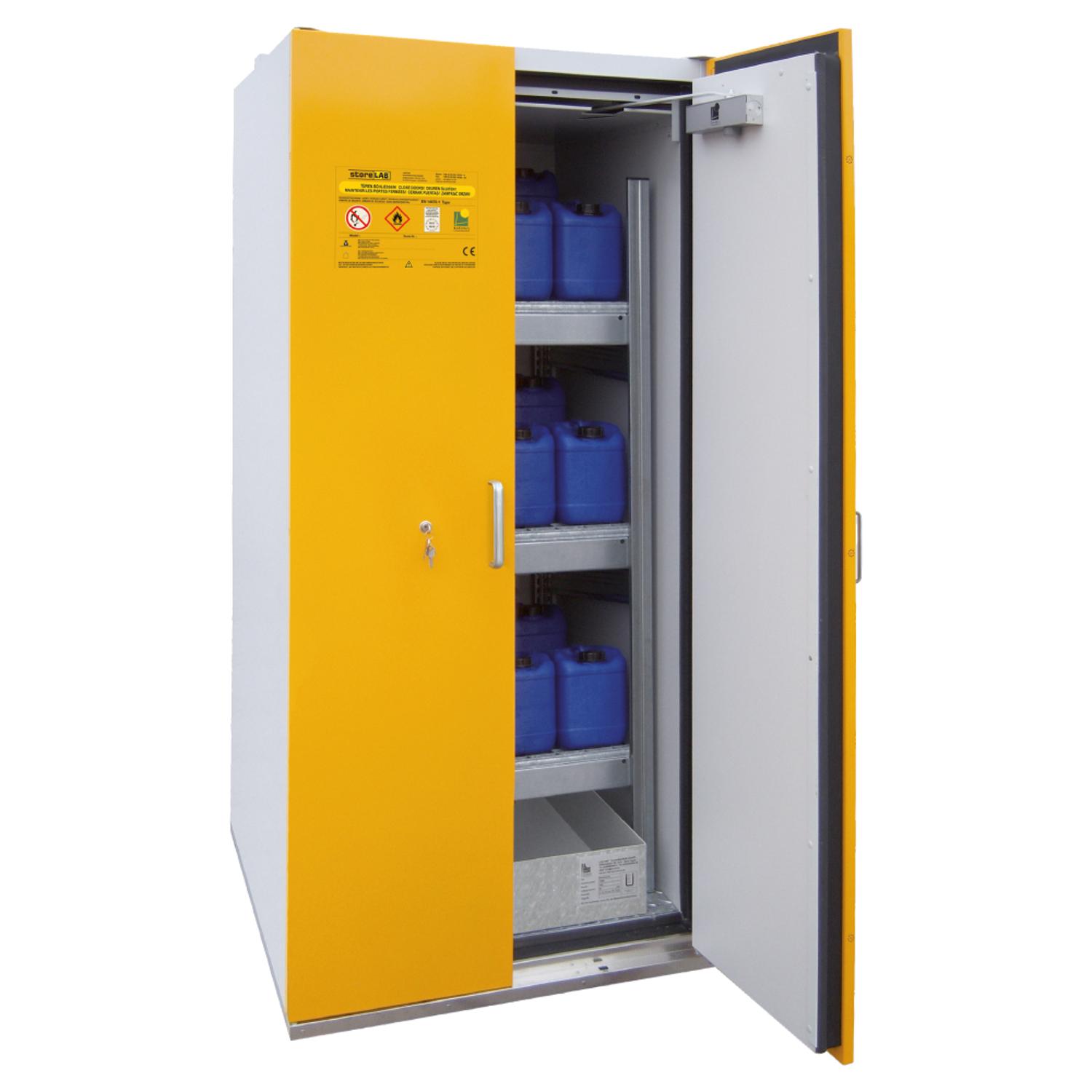 De brandwerende veiligheidskast SIS-FAS 90 / 900 KG GR is speciaal ontwikkeld voor de inpandige opslag van gevaarlijke stoffen conform de PGS 15. De veiligheidskast biedt ruimte voor opslag van kleine verpakkingen op 3 roosterlegborden. Met een brandwerendheid van 90 minuten en een productcertificaat volgens EN 14470-1 voldoet deze brandveilige opslagkast aan alle wettelijke normen.
