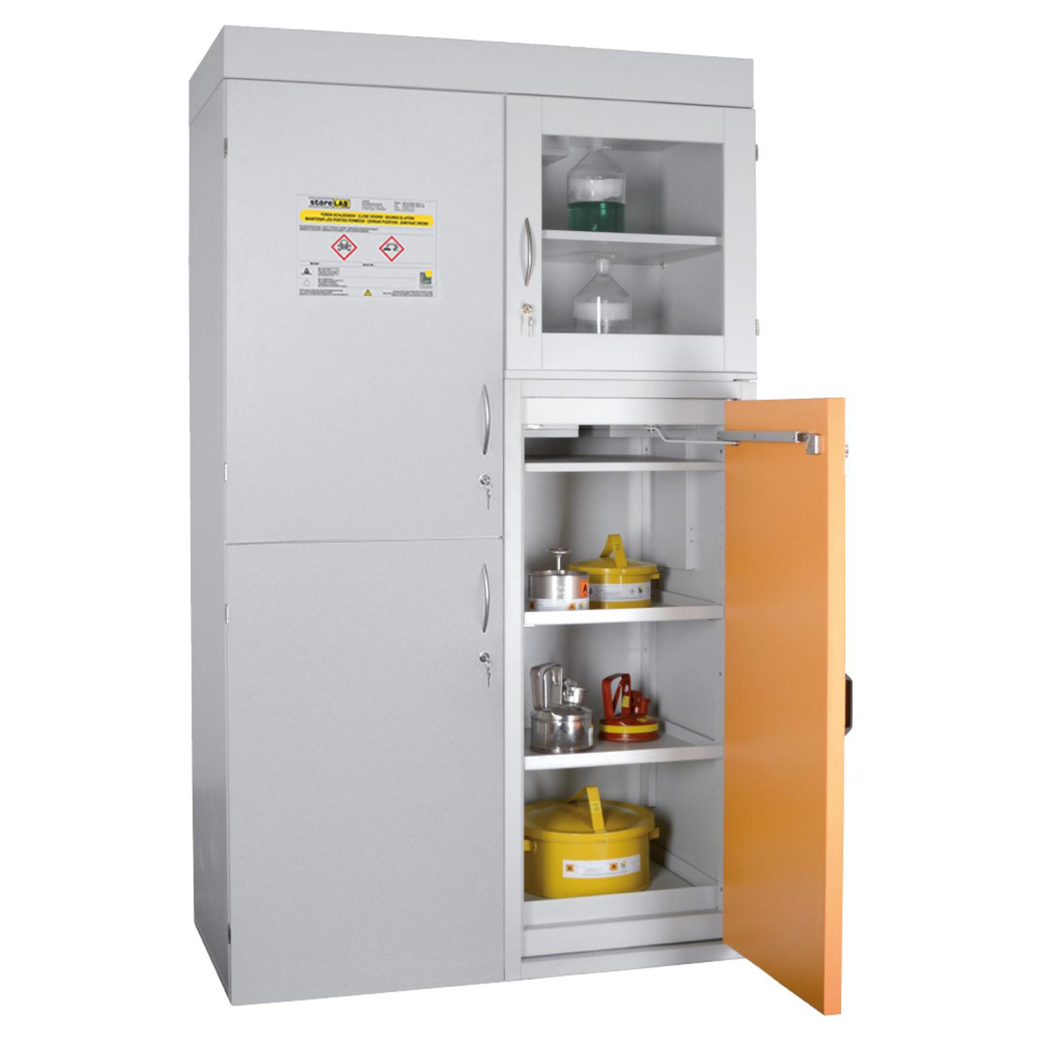 De Combilab veiligheidskast is een combinatie van een brandwerende veiligheidskast, een zuren- en een logenkast.