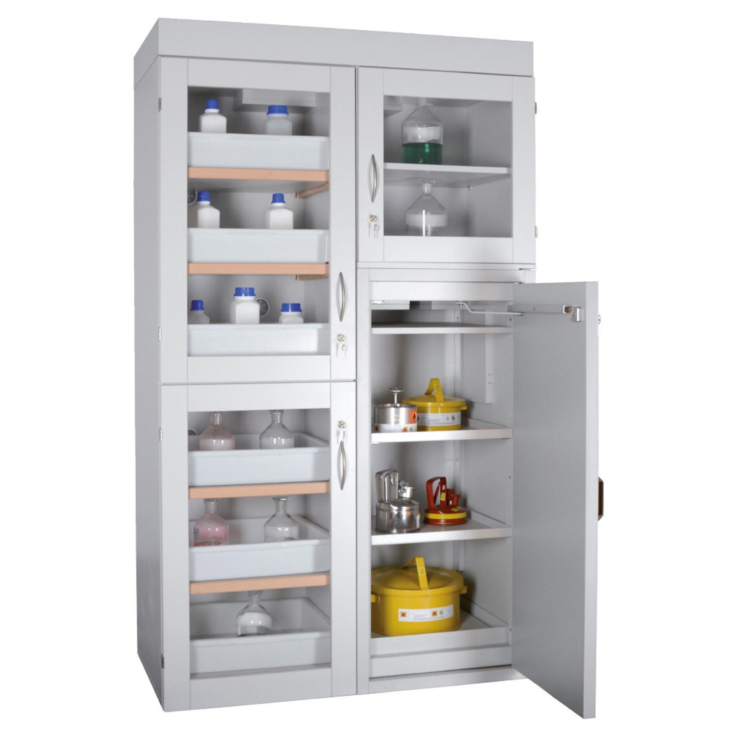 De twee compartimenten zijn voorzien van elk een afzonderlijke afsluitbare deur. De deuren van de zuren- en logenkast voorzien van HPL coating in de kleur RAL 7038. Daarnaast zijn de deuren leverbaar met plexiglas vensters.