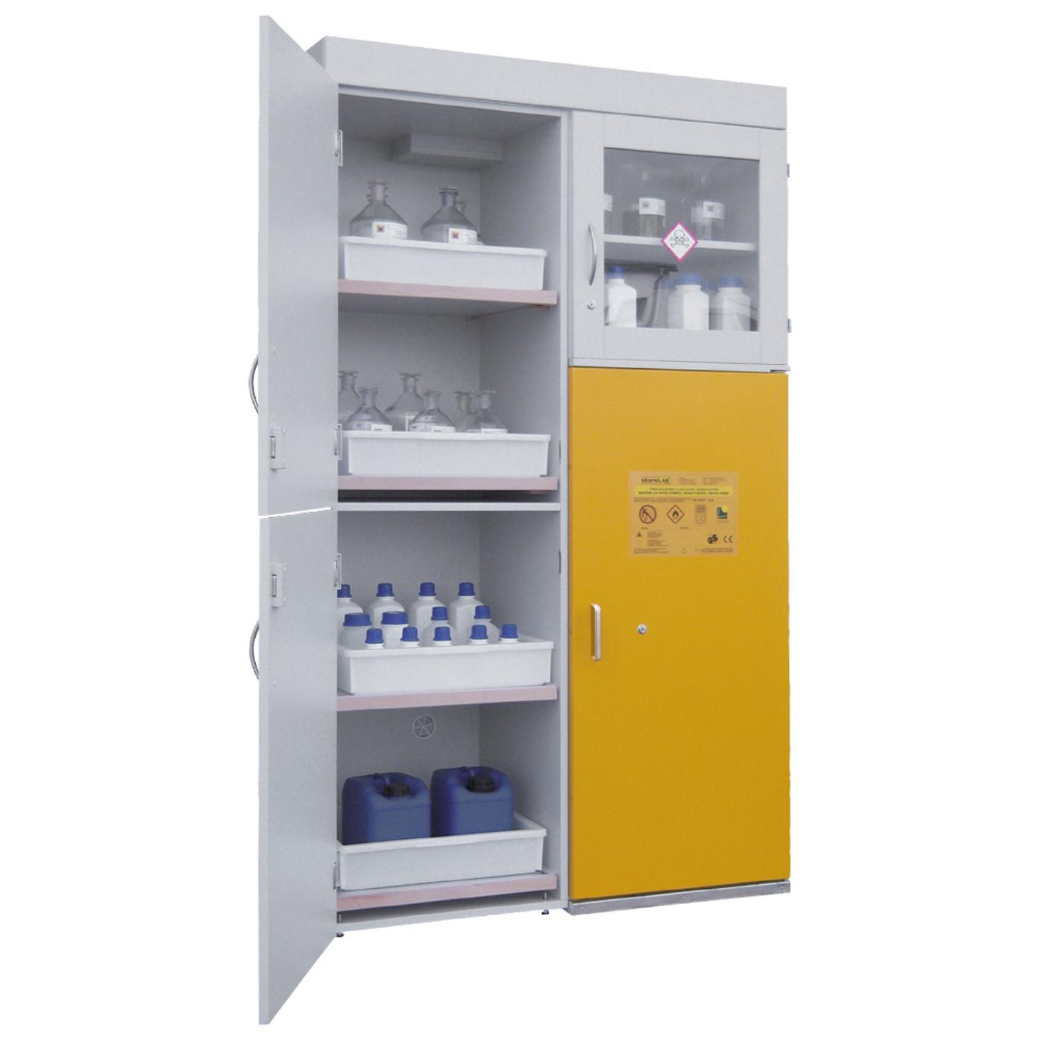 De Combilab veiligheidskast is een combinatie van een brandwerende veiligheidskast, een zuren- en een logenkast.