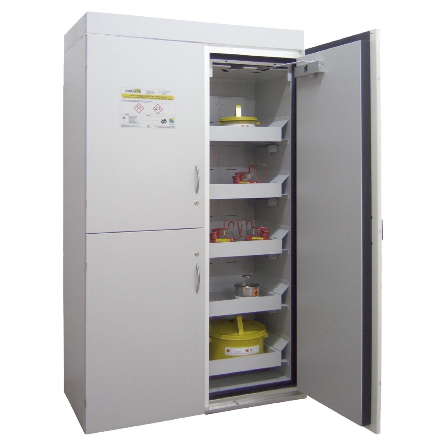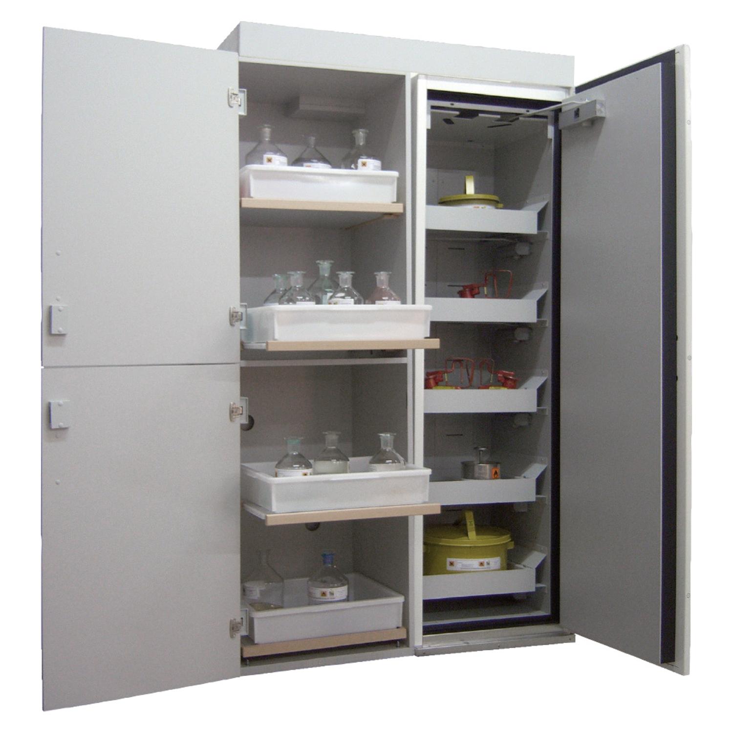 De zuren- en logenkast is uitgevoerd met vier volledig uittrekbare plateaus met eindaanslag. Het draagvermogen is 20 kg per plateau. Elk plateau is voorzien van een uitneembare PE lekbak van 20 liter welke tegen verschuiven is beveiligd. De benutbare binnen hoogte is 4 x 420 mm.