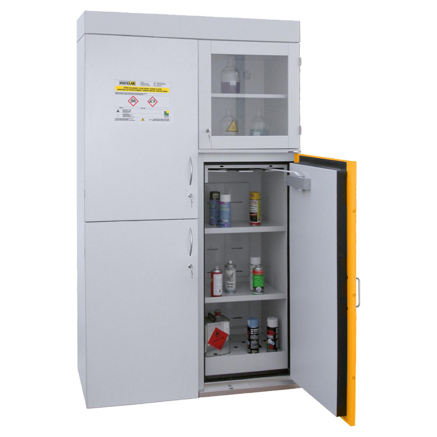 De Combilab veiligheidskast is een combinatie van een brandwerende veiligheidskast, een zuren- en een logenkast.