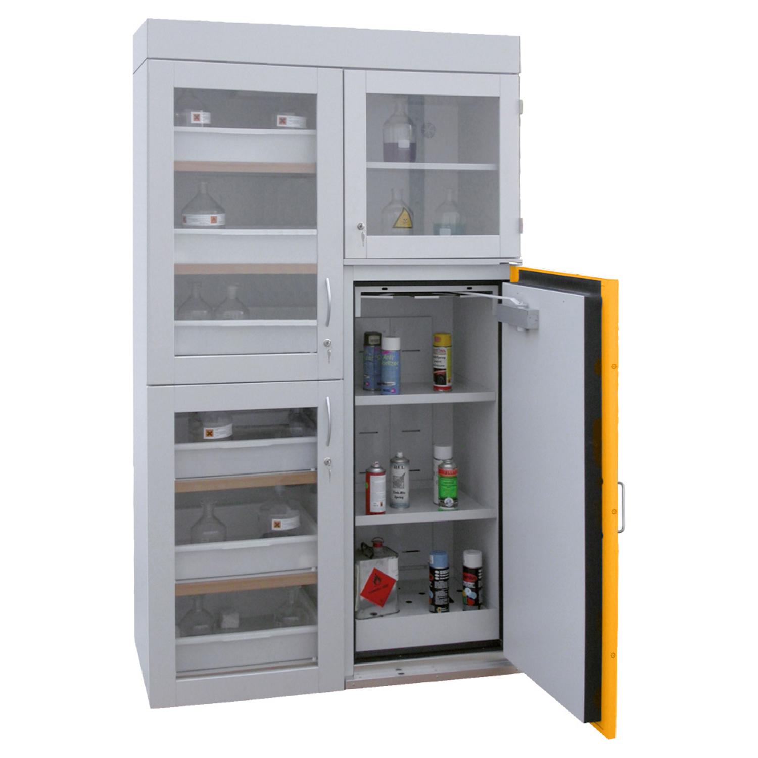 De Combilab veiligheidskast is een combinatie van een brandwerende veiligheidskast, een zuren- en een logenkast.