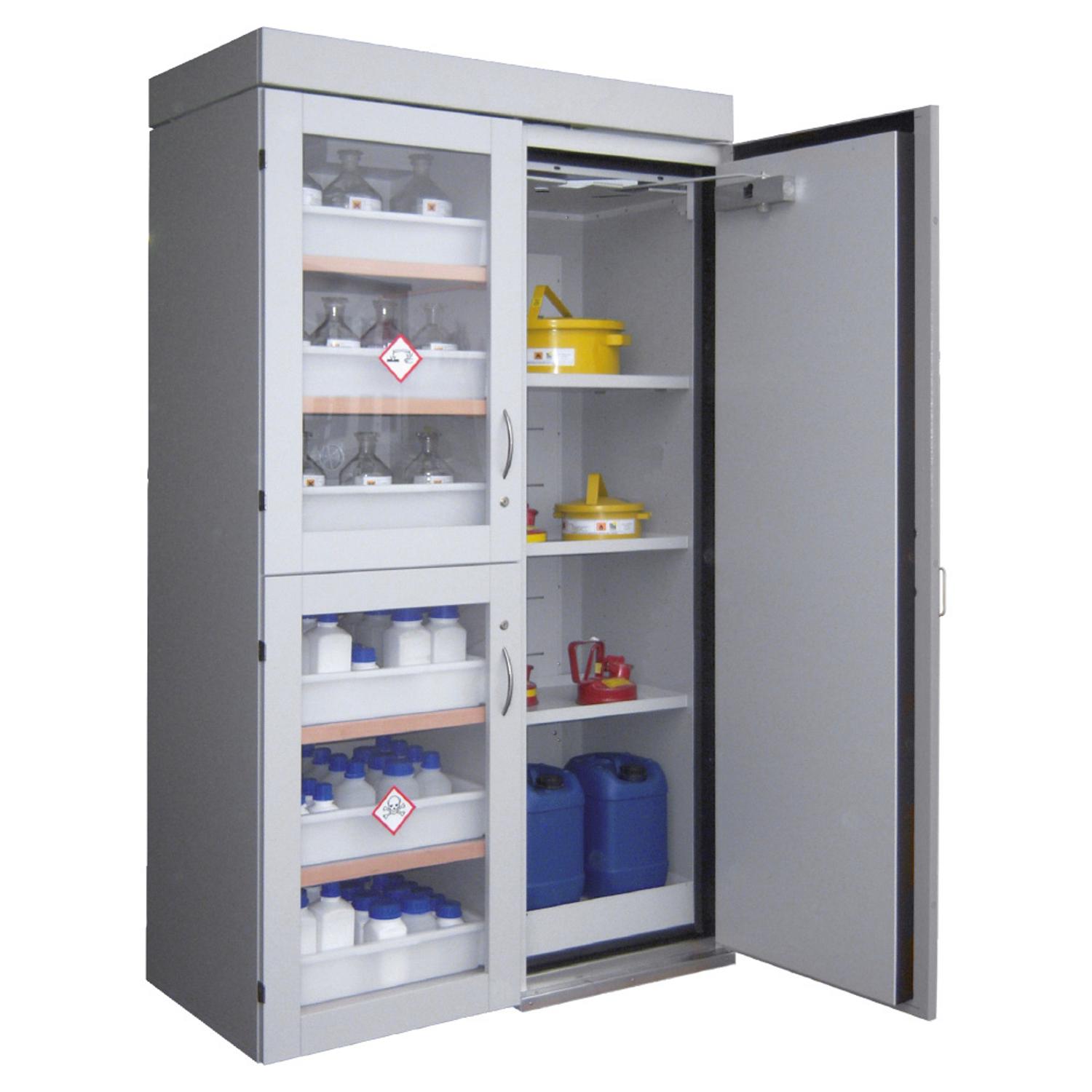 De Combilab veiligheidskast is een combinatie van een brandwerende veiligheidskast, een zuren- en een logenkast.