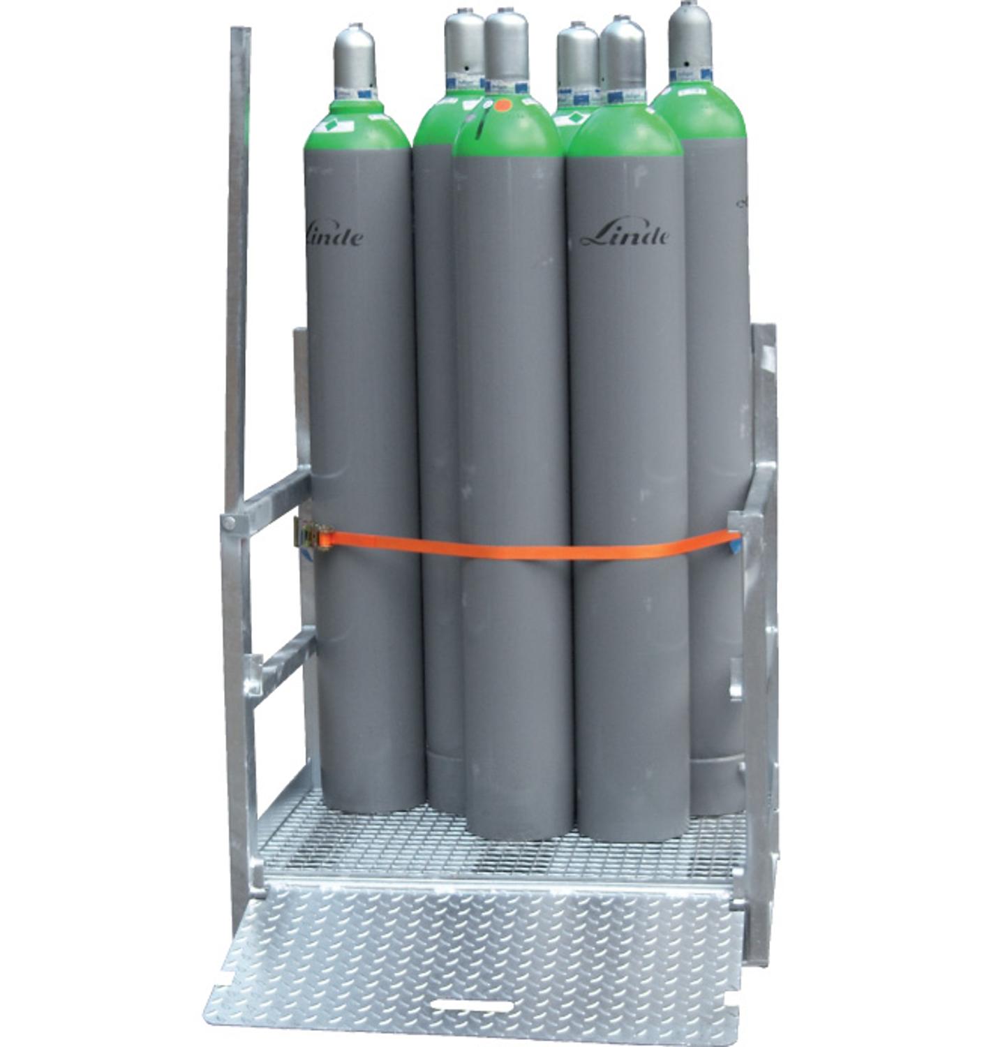 Gasflessenpallet geschikt voor opslag en transport van gasflessen. Solide stalen constructie, volledig thermisch verzinkt. De pallets zijn eenvoudig te verplaatsen door pompwagen of heftruck door de bodemconstructie. Geïntegreerde opklapbare oprijplaat. Wordt gemonteerd geleverd.