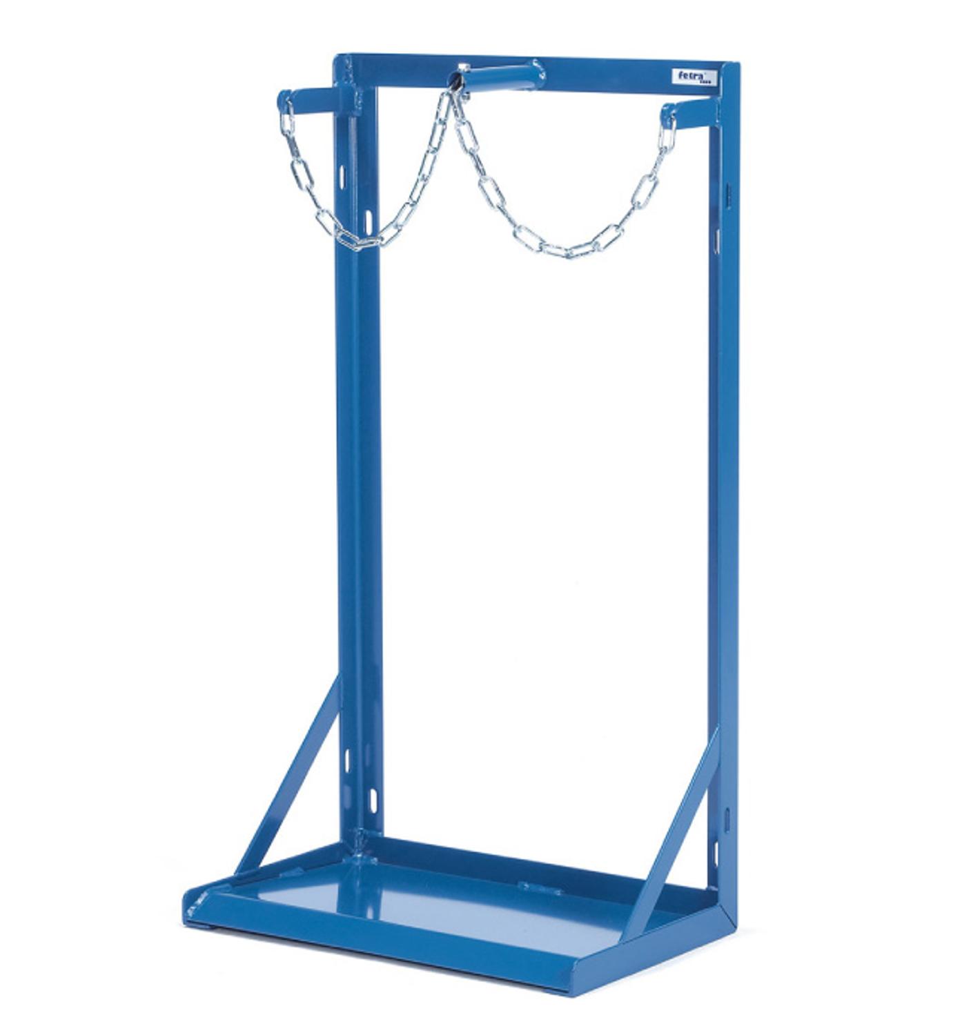De gasflessenhouder bestaat uit profiel- en plaatstaal en is afgewerkt in een hoogwaardige blauwe poedercoating, RAL 5007. Twee afneembare kettingen voorkomen het omvallen van de gasflessen.