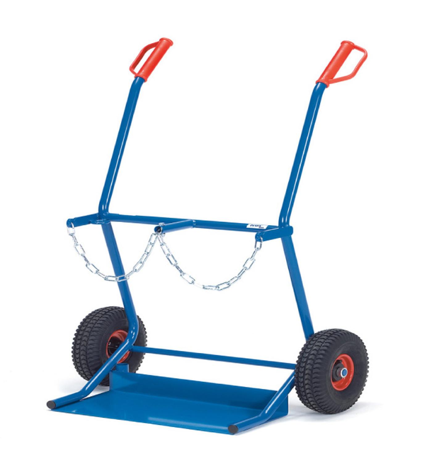 De gasflessenwagen is geschikt voor het veilig verplaatsen van 2 stuks gascilinder met een inhoud van 20 liter. De twee stalen kettingen zijn in het midden aan het frame vastgemaakt en zijn aan beide zijkanten afneembaar om de gasflessen te plaatsen. Tijdens het vervoer de gasflessen beveiligd tegen omvallen door middel van de kettingen.