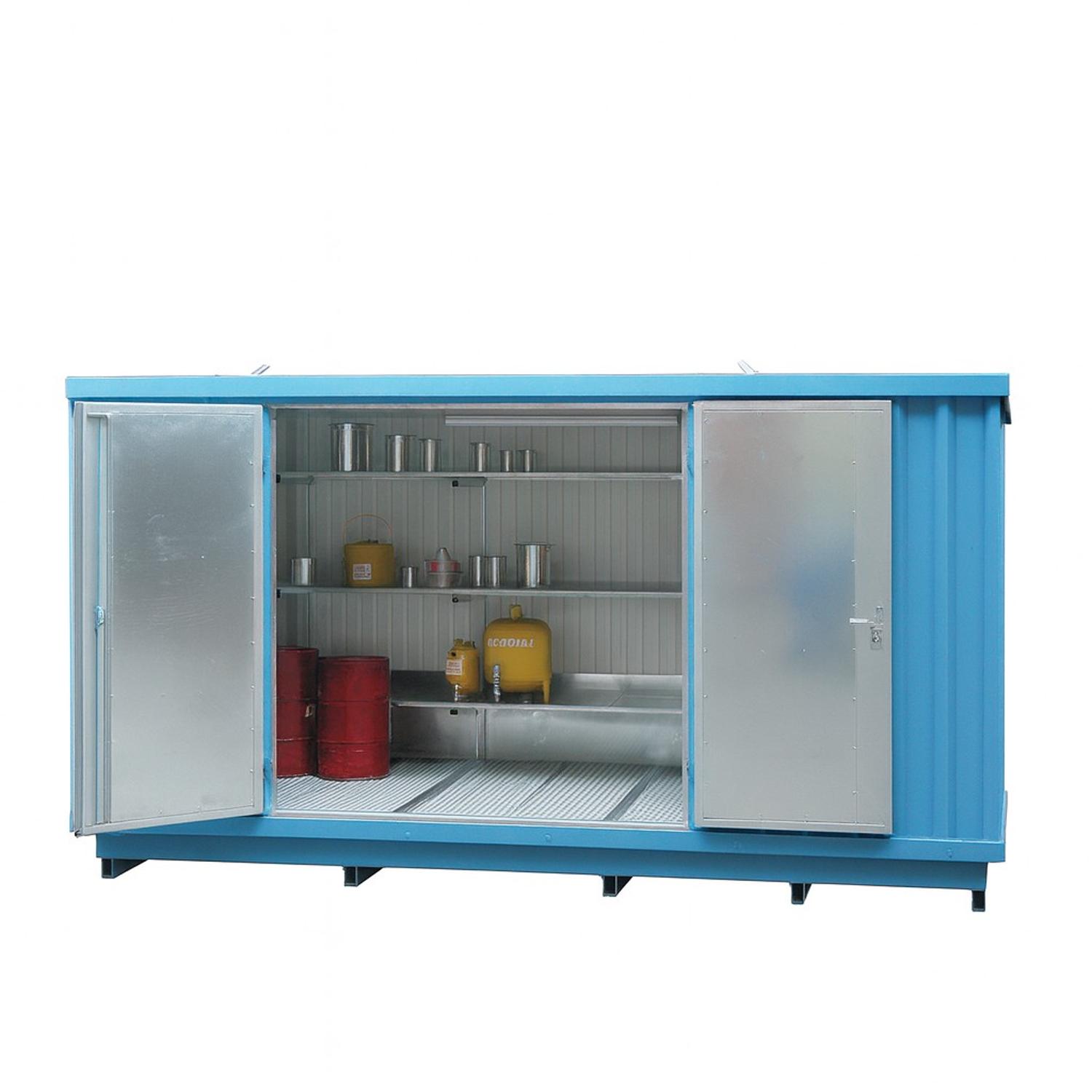 Het interieur van de chemiecontainer is ontwikkelt voor de opslag van gevaarlijke stoffen. Hiervoor zijn alle binnenwanden van vloeistofschotten. Lekkende gevaarlijke stoffen die tegen de schotten lekken, worden naar de lekbak geleid. Hierdoor worden alle gelekte gevaarlijke stoffen naar de lekbak geleid. De milieucontainer kun je geheel naar wens uitvoeren met explosieveilige verlichting, ventilatie of stellingmateriaal. Alle accessoires worden compleet geïnstalleerd waardoor je de milieucontainer meteen kan gebruiken na levering.