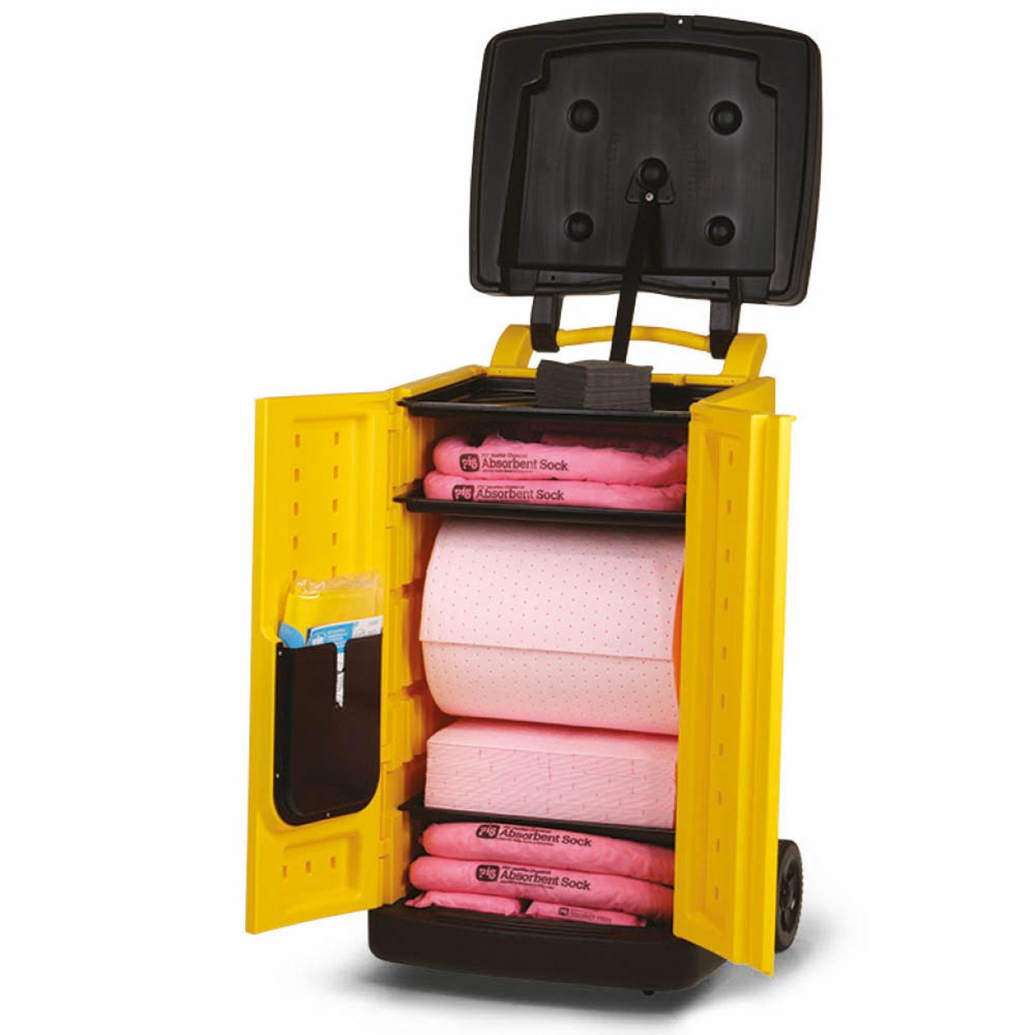 Goed zichtbare felgele spill caddy met klapdeuren voor eenvoudige toegang tot de absorptiemiddelen. Komt met een gemonteerde mattenrol, voor het eenvoudig afscheuren van de benodigde matten. De spill caddy heeft soepele wielen van 20 cm en extra zwenkwielen voor draaien zonder te kantelen, verstelbare planken en kan afgesloten worden middels een slot. Absorbeert tot 190 liter.