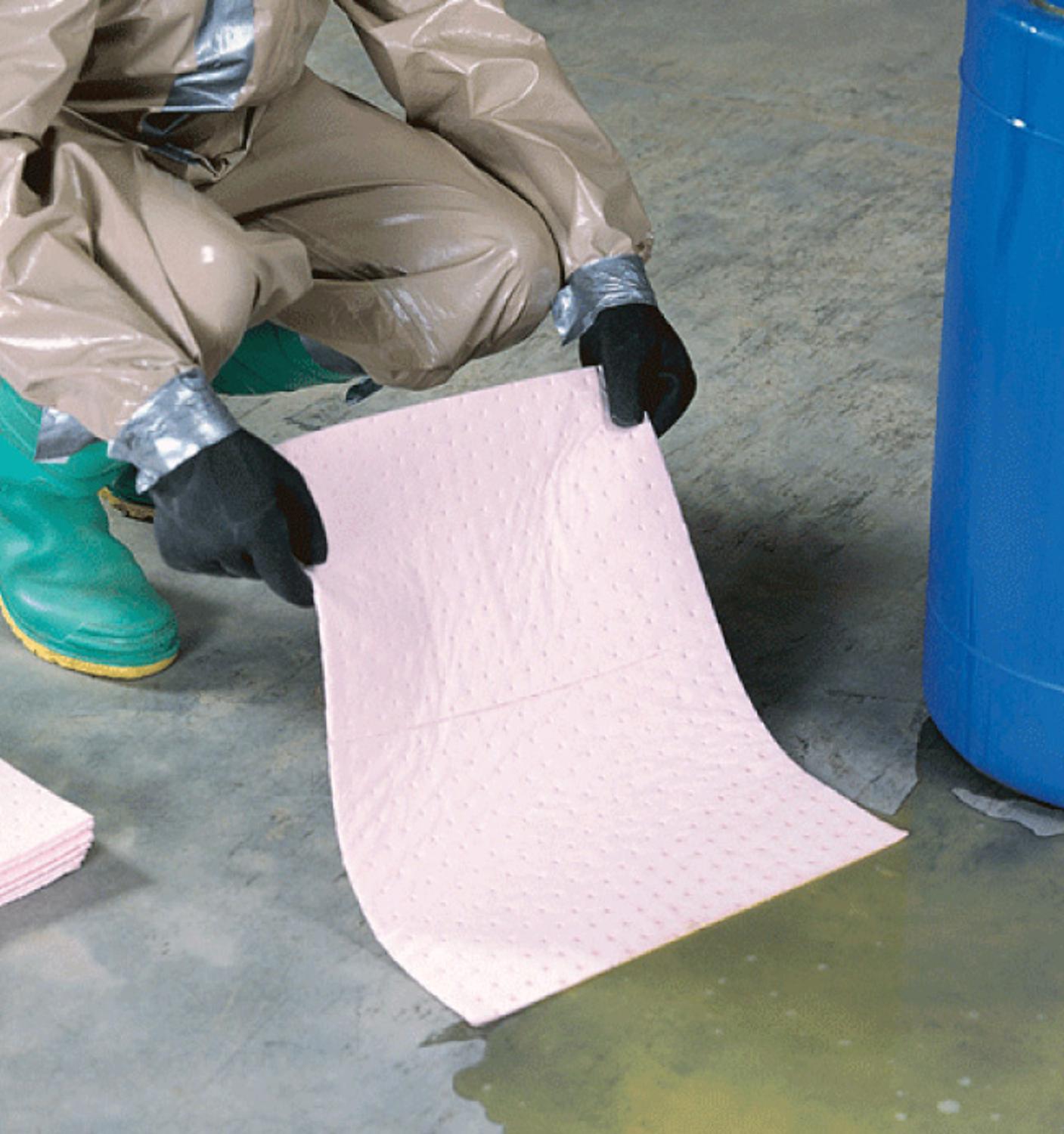 <p>Bestand tegen chemicaliën, géén afbraak of gevaarlijke reactie bij contact met bijtende stoffen. Geperforeerd om gemakkelijk te scheuren naar het gewenste formaat. Dankzij de roze kleur zijn lekkages en spillages snel te herkennen. Ideaal voor het absorberen van zwavelzuur van kleine accu's of laboratorium lekkages</p>