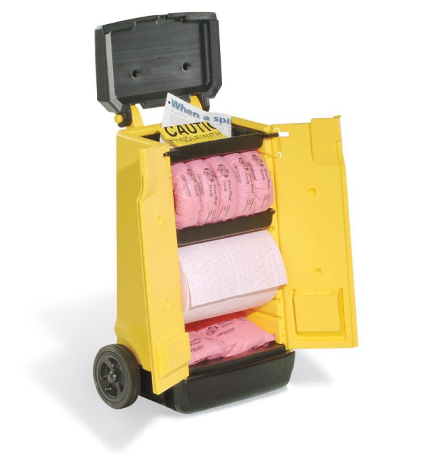 Goed zichtbare felgele spill cart met klapdeuren en deksel voor eenvoudige toegang tot de absorptiemiddelen. Komt met een gemonteerde mattenrol, voor het eenvoudig afscheuren van de benodigde matten. Moeiteloos manoeuvreren, zelfs door deuropeningen, dankzij het tip-back ontwerp en de anti-slip wielen van 17,75 cm. Absorbeert tot 75 liter.