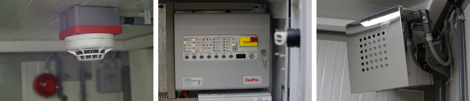 De lithium opslagsystemen zijn uitgevoerd met een permanente branddetectie, door middel van een dubbel uitgevoerd detectiesysteem wordt de lithium opslag permanent gemonitord. Een hoogwaardige brandmeldinstallatie meldt de brand in een vroeg stadium en alarmeert de directe omgeving middels flitslamp en sirene. Daarnaast wordt de brand doorgemeld naar een alarmcentrale of brandweer. Op deze manier kan direct actie worden ondernomen bij een calamiteit met lithium batterijen. Brandonderdrukking vindt plaats door middel van droge aerosolblussing, waardoor de brand meteen bestreden wordt. Deze techniek dooft de brandende lithium accu en spaart de overige accu’s. Na de brand is de voorraad lithium accu’s en de opslagvoorziening intact, de uitgebrande accu kan vervolgens verwijderd worden.