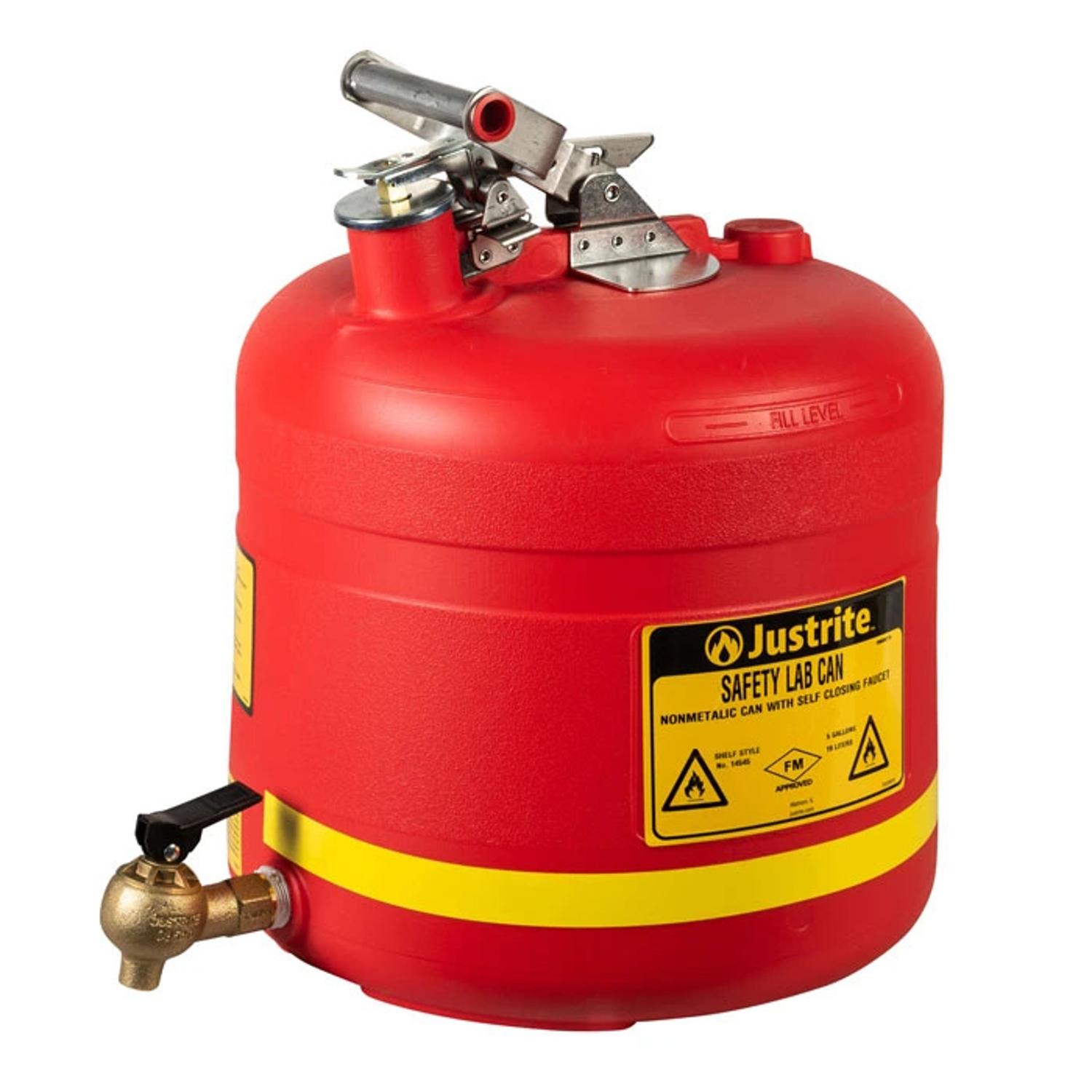 Chemicaliënbestendige, ronde HDPE veiligheidskan biedt een veilige opslag voor ontvlambare bijtende stoffen in een ruimtebesparend ontwerp. Uitgevoerd met een wijde opening voor het eenvoudig vullen en het veersluitend RVS deksel zorgt voor een goede afdichting. De tapkraan zit 51 mm boven de bodem gemonteerd, voor gebruik op legborden.