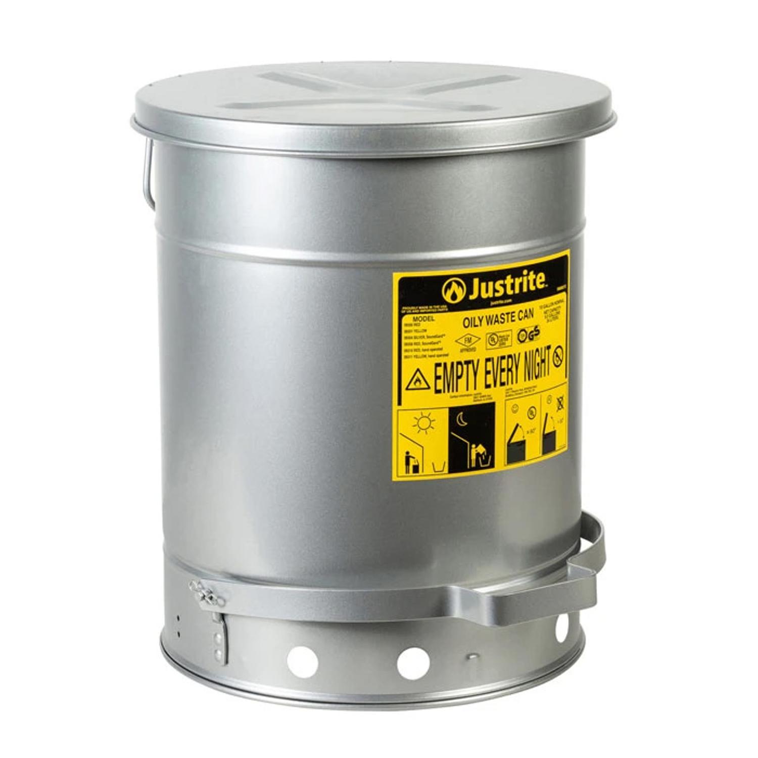 Ronde afvalbakken met SoundGard demping in de deksels. Voor het veilig weggooien van poetsdoeken, onderhouds- en reinigingsdoeken met ontvlambare vloeistoffen. De afvalbak deksels blijven gesloten wanneer ze niet in gebruik zijn om resten van brandbronnen te isoleren en de beschikbare zuurstof te beperken.