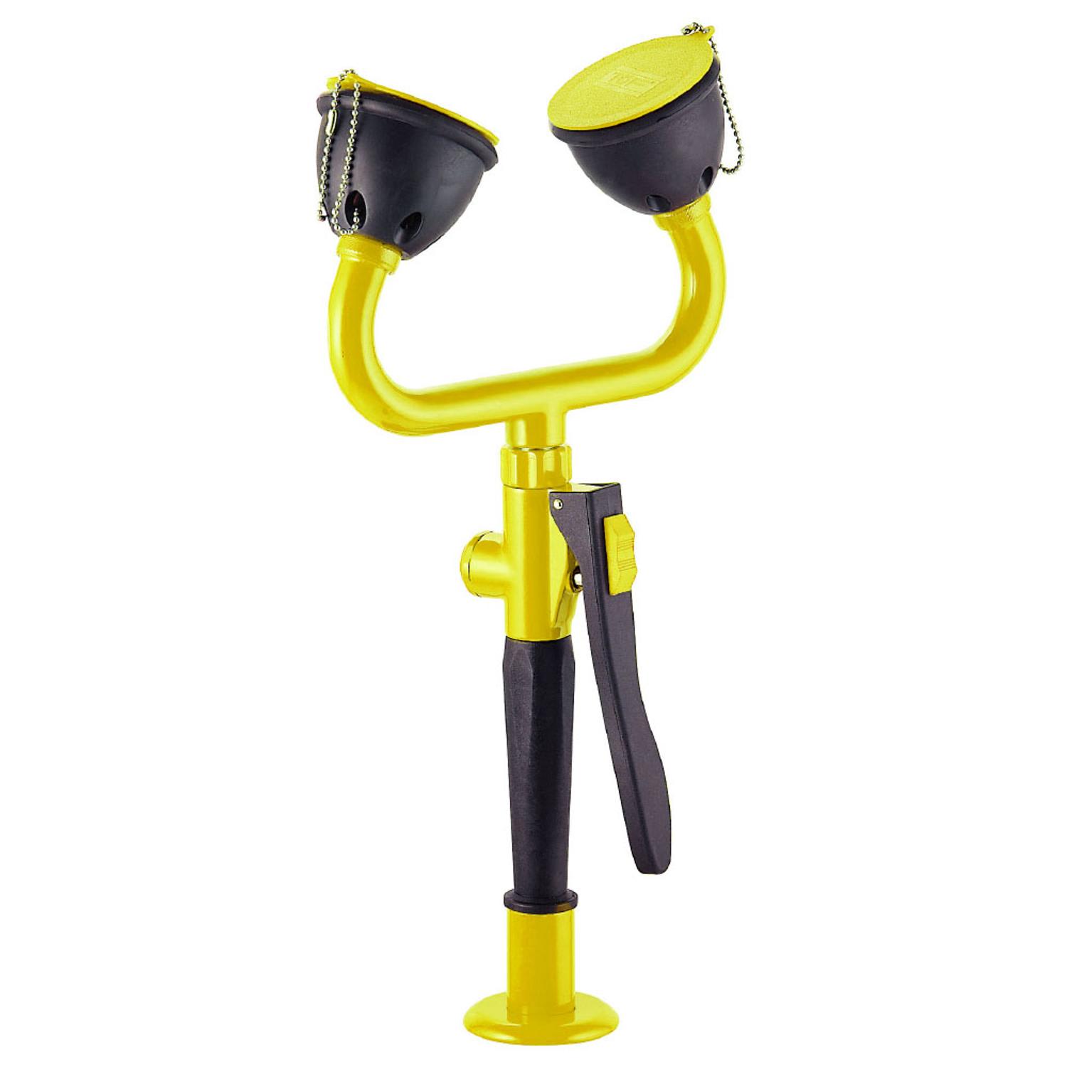 De activatie van de knijp oogdouche is met een eenvoudige knijpbeweging. Na activeren blijft conform de norm de afsluiter geopend zelfs nadat je stopt met knijpen. Om de knijp oogdouche te deactiveren druk je eenvoudig het kleine knopje in.