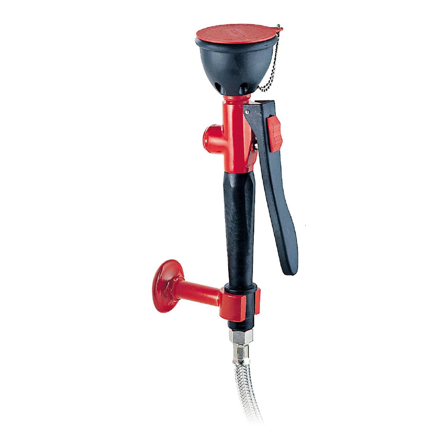 De activatie van de knijp oogdouche is met een eenvoudige knijpbeweging. Na activeren blijft conform de norm de afsluiter geopend zelfs nadat je stopt met knijpen. Om de knijp oogdouche te deactiveren druk je eenvoudig het kleine knopje in.