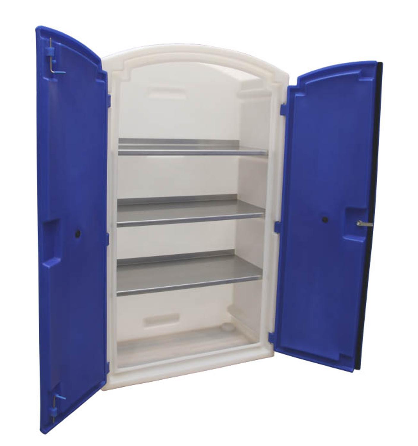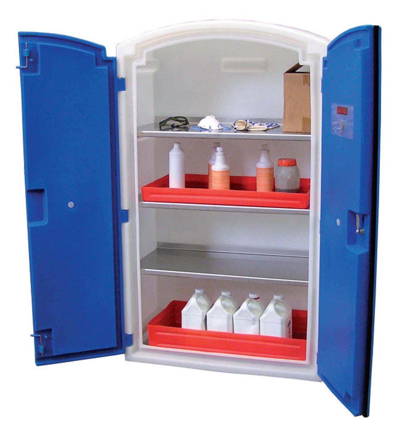De milieukast is speciaal ontworpen voor de opslag van agressieve vloeistoffen zoals zuren, logen en andere bijtende stoffen. De draaideuren zijn gemaakt van kunststof polyethyleen en worden geleverd in de kleur blauw.