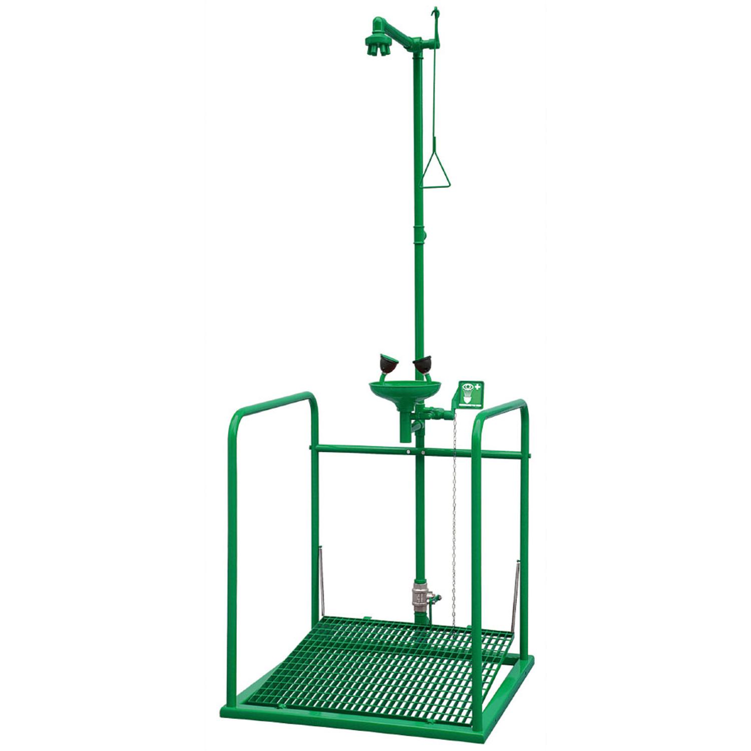 De vrijstaande nood- en oogdouche combinatie met platform bediening is geschikt voor binnen gebruik en specifiek ontworpen voor het spoelen van twee ogen en het lichaam in laboratoria, ziekenhuizen, scholen, voedingsmiddelen- en petrochemische industrie.
