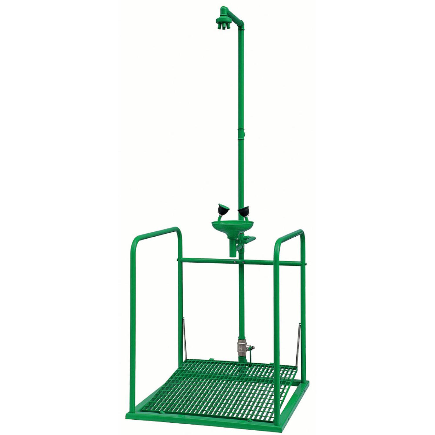 De nood- en oogdouche combinatie is geheel vrijstaand te plaatsen dankzij het platform syteem, een solide buizenconstructie vastgelast op een vloerframe van 850 x 850 mm.