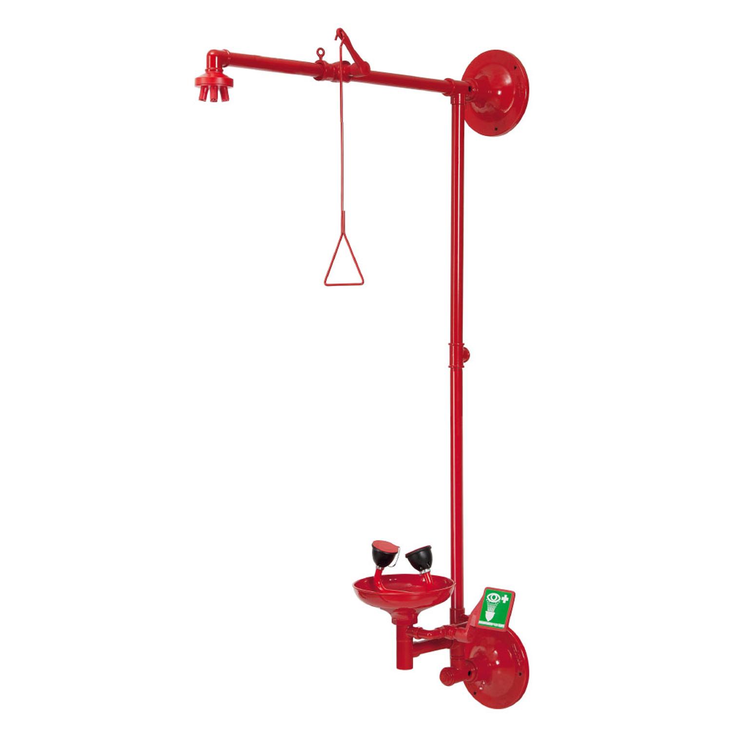 Geschikt voor wandmontage Solide, industriële uitvoering met kunststof onderdelen Gegalvaniseerde leidingen en afsluiter voorzien van epoxycoating in kleur Grote trekstang voor activatie van lichaamsdouche Speciale sproeikop voor efficiënte waterverdeling Inclusief internationaal nooddouche pictogram Conform EN-15154 & DIN 12899Oogdouche