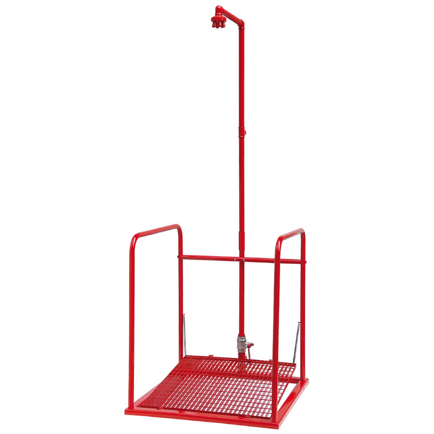 De nooddouche is geheel vrijstaand te plaatsen dankzij het platform syteem, een solide buizenconstructie vastgelast op een vloerframe van 850 x 850 mm.