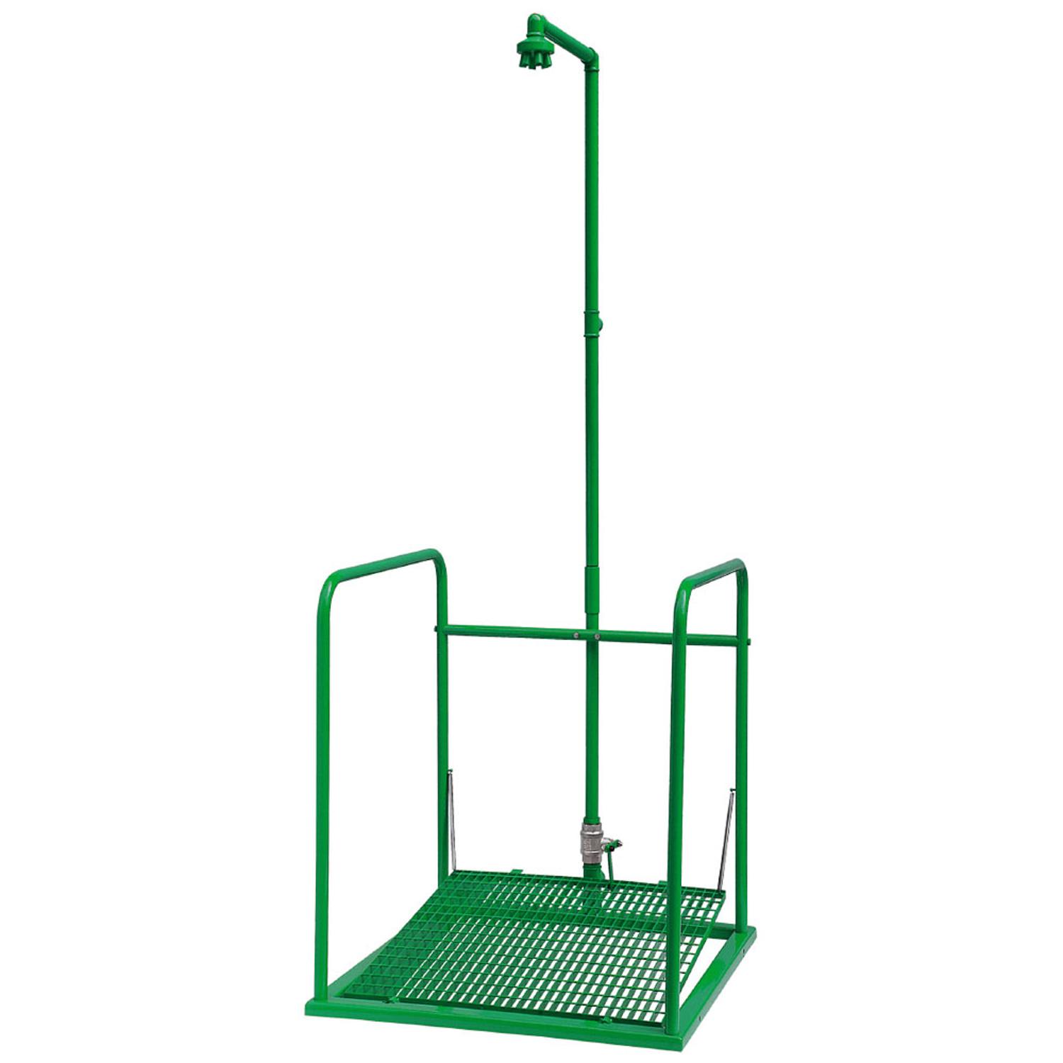 De nooddouche is geheel vrijstaand te plaatsen dankzij het platform syteem, een solide buizenconstructie vastgelast op een vloerframe van 850 x 850 mm.