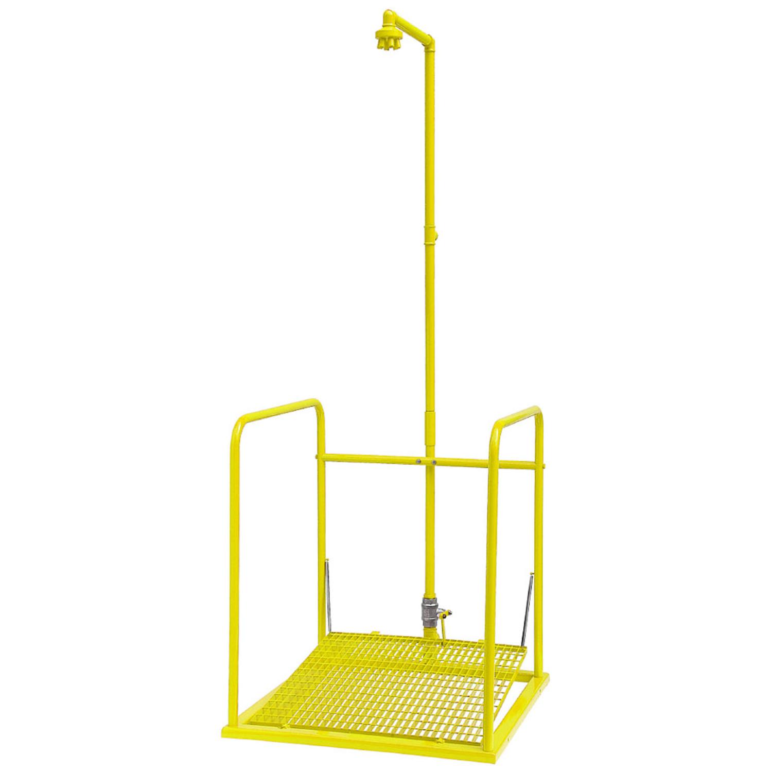 De nooddouche is geheel vrijstaand te plaatsen dankzij het platform syteem, een solide buizenconstructie vastgelast op een vloerframe van 850 x 850 mm.