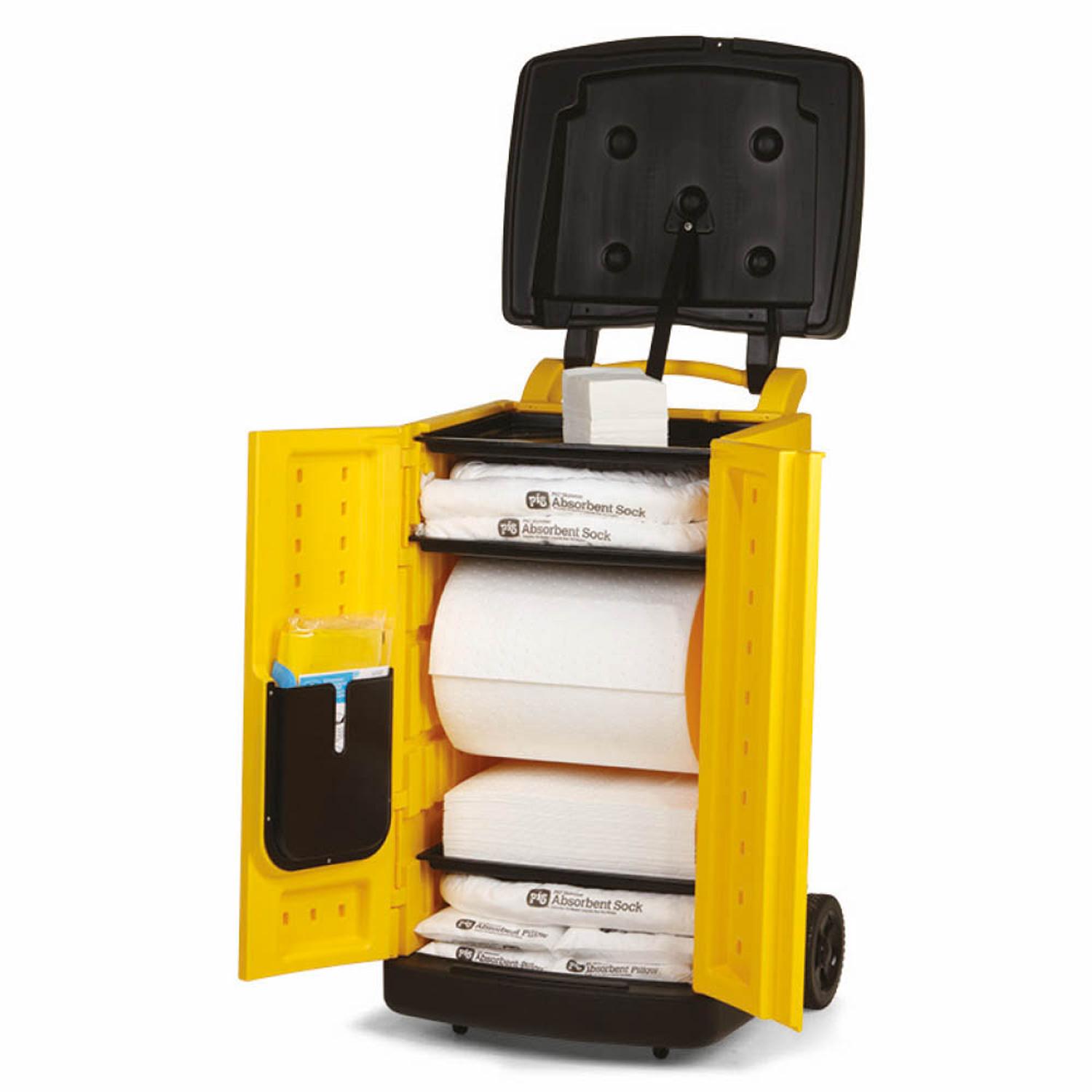 Goed zichtbare felgele spill caddy met klapdeuren voor eenvoudige toegang tot de absorptiemiddelen. Komt met een gemonteerde mattenrol, voor het eenvoudig afscheuren van de benodigde matten. De spill caddy heeft soepele wielen van 20 cm en extra zwenkwielen voor draaien zonder te kantelen, verstelbare planken en kan afgesloten worden middels een slot. Absorbeert tot 190 liter.