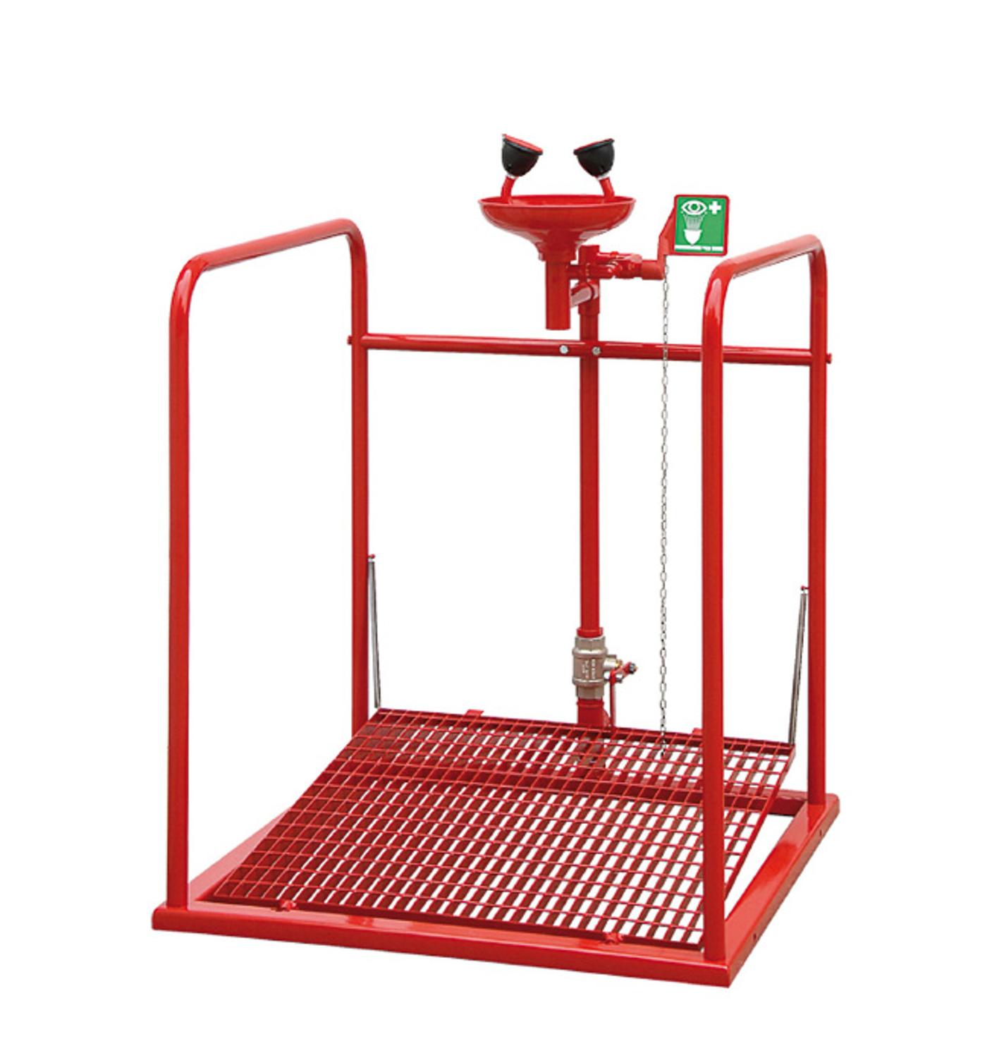 De oogdouche met opvangschaal is geheel vrijstaand te plaatsen dankzij het platform syteem, een solide buizenconstructie vastgelast op een vloerframe van 850 x 850 mm.