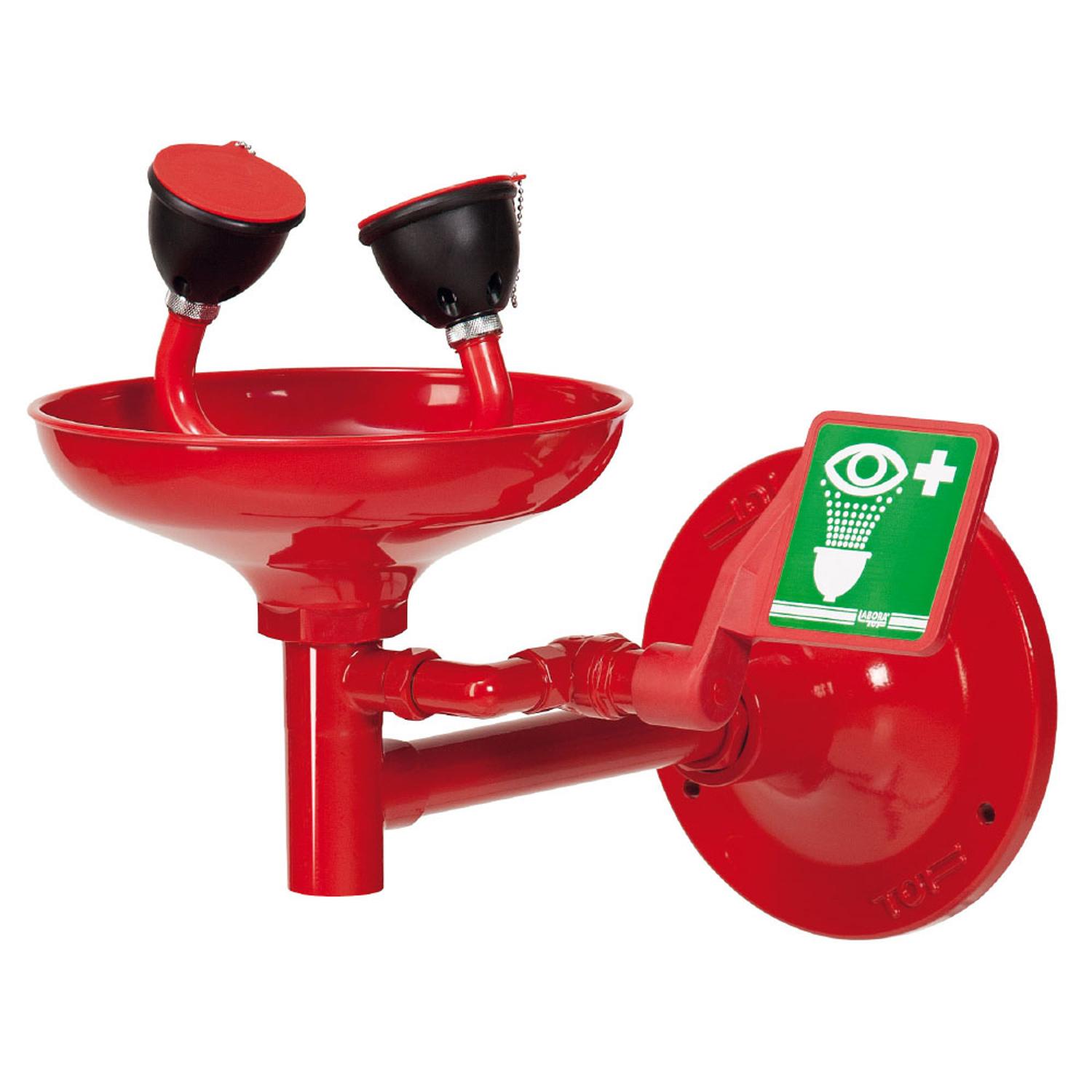 De oogdouche voor wandmontage met kunststof opvangschaal is zonder meerprijs leverbaar in rood, groen of geel.