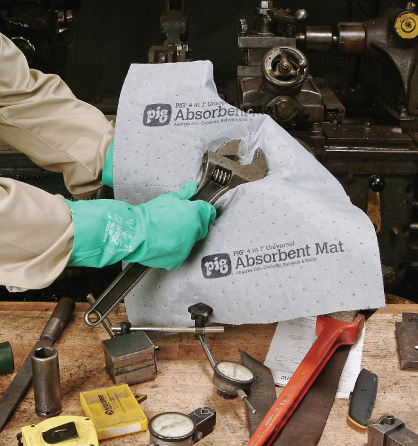 4-IN-1 Universele absorptiemat, absorbeert grote hoeveelheden olie, koelvloeistoffen en oplosmiddelen. De matten zijn o.a. geschikt voor de absorptie van; aceton, chloroform, mineraal olie, fenol, tuoleen en water. Gebruik het als mat voor oliedruppels en spillages; als rol om grote gebieden te bedekken; vouw het langs de perforatierand om een dikke sok te vormen; scheur het af om te gebruiken als een nauwelijks pluizende poetsdoek. De absorptiematten bestaan uit 8 lagen van 100% polypropyleen en zijn thermisch gebonden.