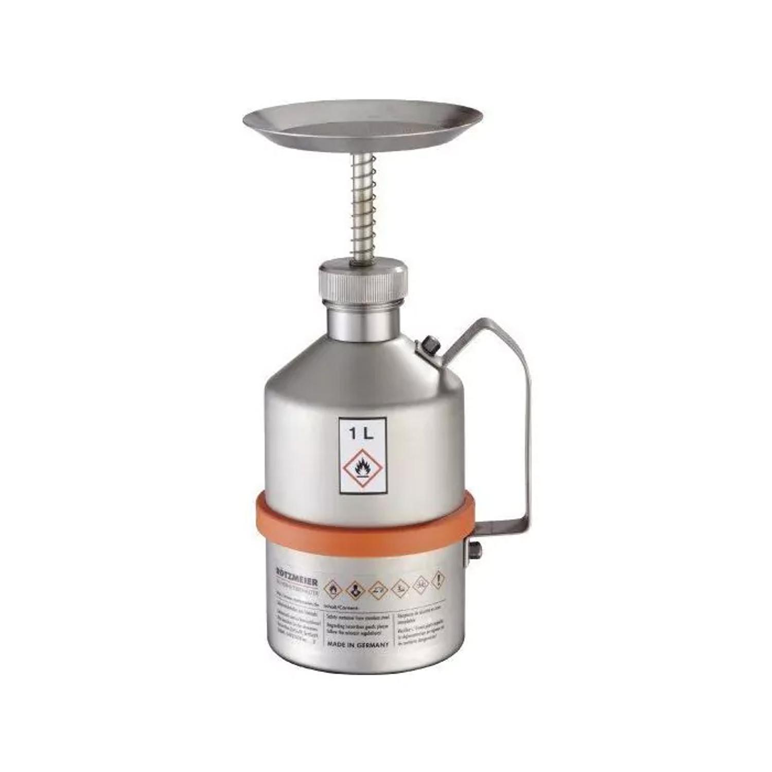 Veiligheids plunjerkannen van hoogwaardig en chemisch bestendig RVS 1.4404 (316) met een dikte van 0,6 mm, handgreep van de plunjerkan is ook van massief RVS. Voor het gecontroleerd en zuinig bevochtigen van reinigingsdoeken snel en eenvoudig. Veilge afgifte van ontvlambare vloeistoffen en oplosmiddelen zonder afval en blootstelling.