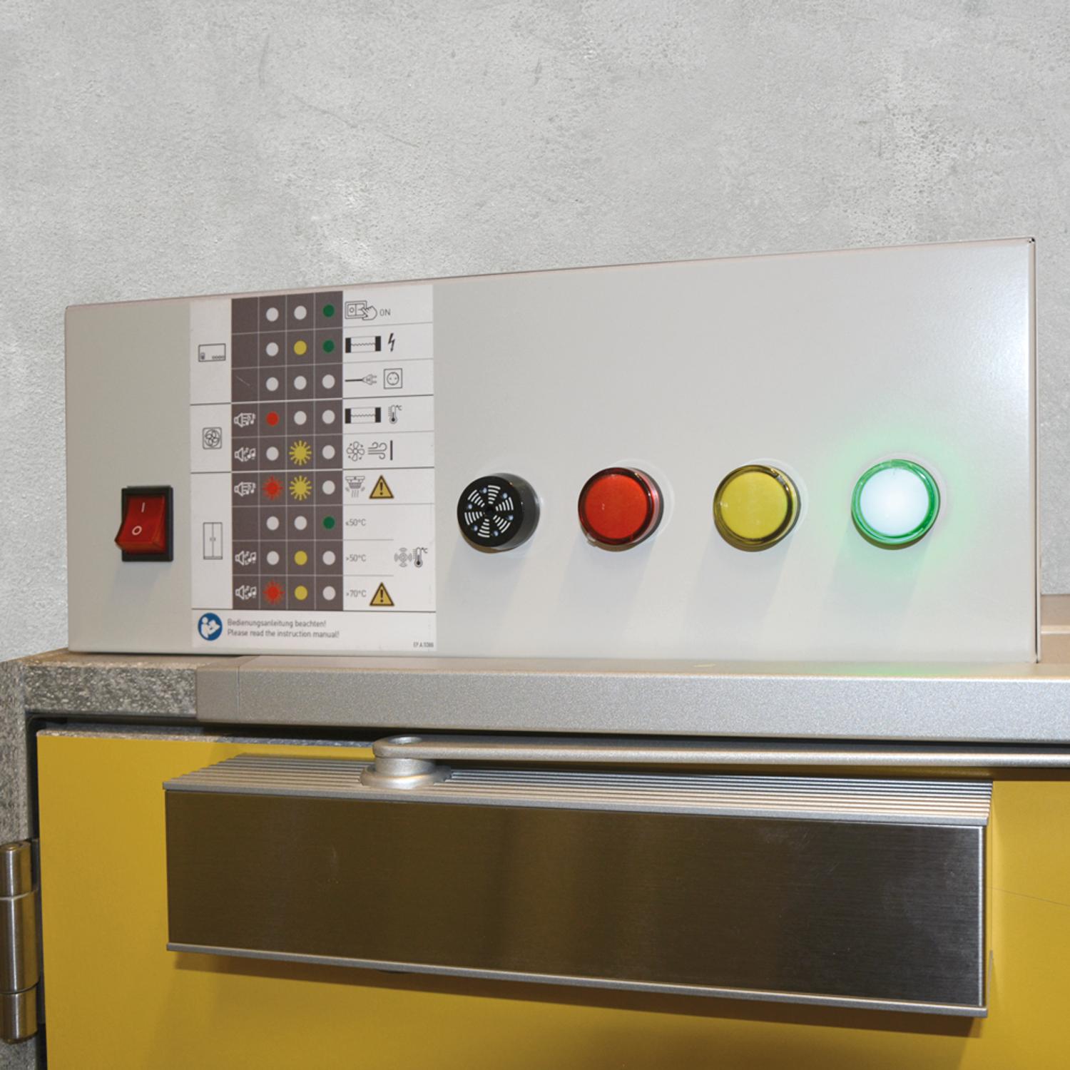 Standaard is de LI-ION PRO STORE voorzien van een dubbel branddetectiesysteem op basis van rook- en hittemelders. Bij brand schakelt het systeem automatisch de ventilatie en stroomtoevoer uit. De controle-unit boven op de kast geeft een optisch en akoestisch alarmsignaal en beschikt over een potentiaalvrij contact voor doormelding naar een extern alarm- of gebouwbeheersysteem. Optioneel is een GSM-module leverbaar voor alarmering op afstand.