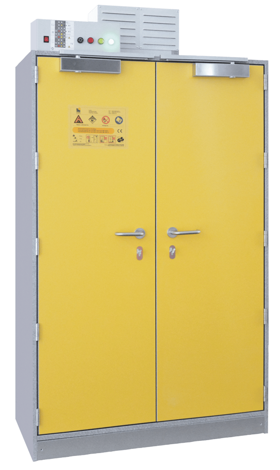 De lithium veiligheidskast is vervaardigd uit onbrandbare materialen conform EN 13501-2. De robuuste behuizing is afgewerkt met een lichtgrijze coating en heeft een dubbele deur in RAL 1023 (geel). Dankzij de corrosiebestendige eigenschappen is de kast geschikt voor langdurig en veilig gebruik in diverse omgevingen.