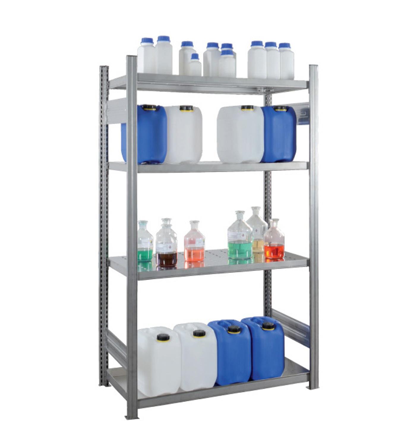 ruik in laboratoria, ziekenhuizen en voedingsmiddelen industrie. De opslagstelling is voorzien van 4 opstelniveaus voor een totale segmentlast van maximaal 1.000 kg. Draagvermogen per legbord is 150 kg bij een gelijkmatig verdeelde last. De levering van de basisstelling bestaat uit; 2 staanderframes, 3 geperforeerde legborden en 1 opvangbak.Uitbreiding door aanbouwsegmenten
