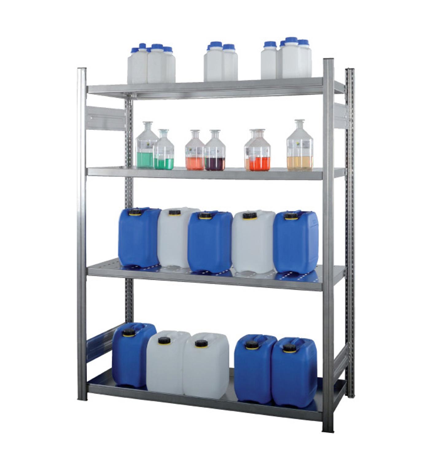 ruik in laboratoria, ziekenhuizen en voedingsmiddelen industrie. De opslagstelling is voorzien van 4 opstelniveaus voor een totale segmentlast van maximaal 1.000 kg. Draagvermogen per legbord is 150 kg bij een gelijkmatig verdeelde last. De levering van de basisstelling bestaat uit; 2 staanderframes, 3 geperforeerde legborden en 1 opvangbak.Uitbreiding door aanbouwsegmenten