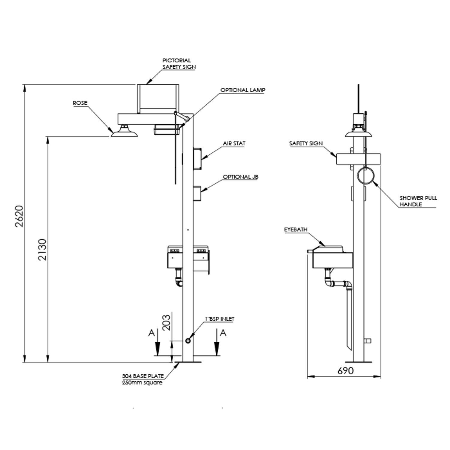 De RVS 316 standpijp is omwikkeld met een geïsoleerd en elektrisch verwarmingslint uitgevoerd met een AIR STAT thermostaat. Deze heeft een verwarmingsbelasting van 60 W hierdoor is de combinatie nood- en oogdouche tot -30ºC te gebruiken.