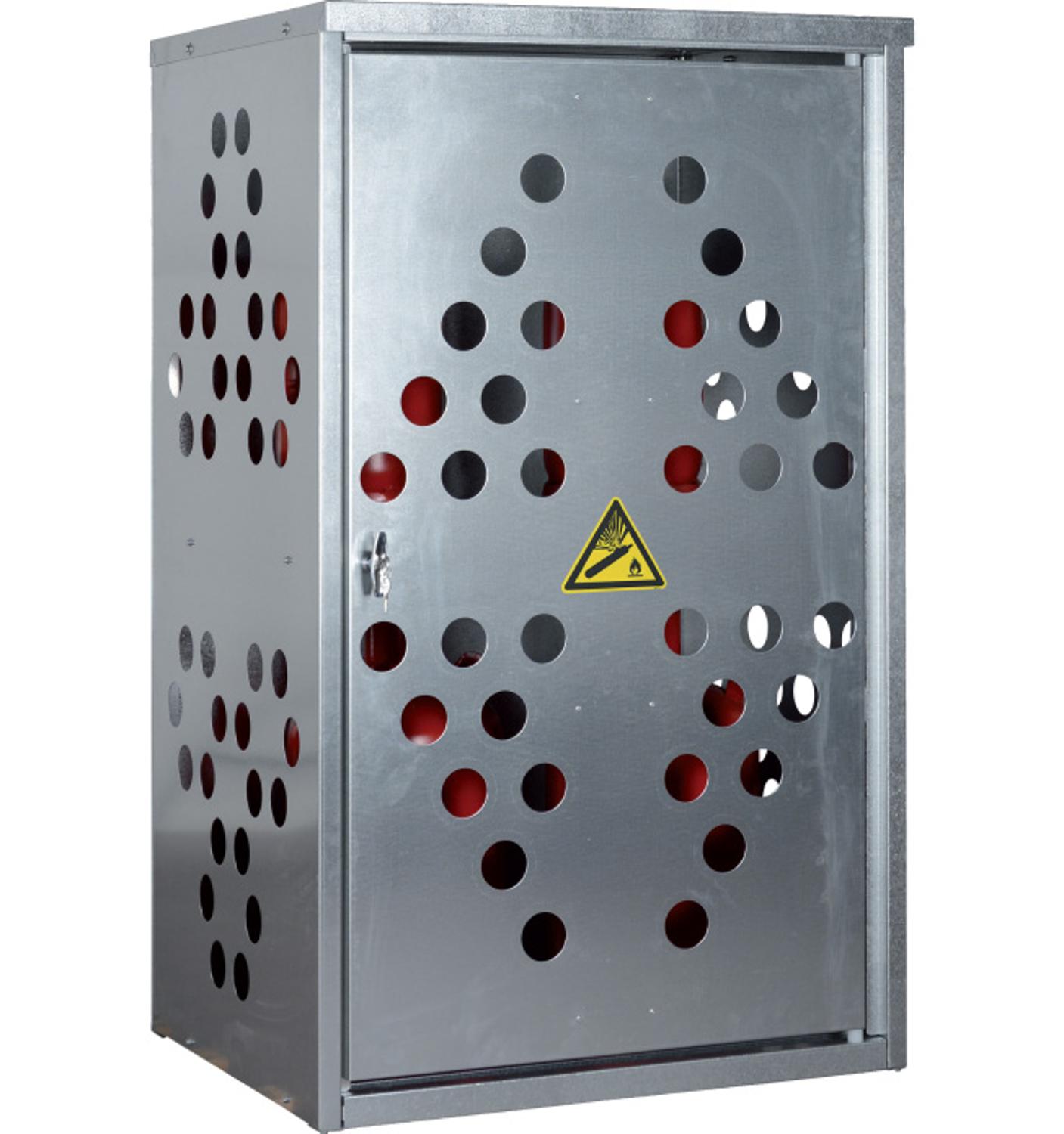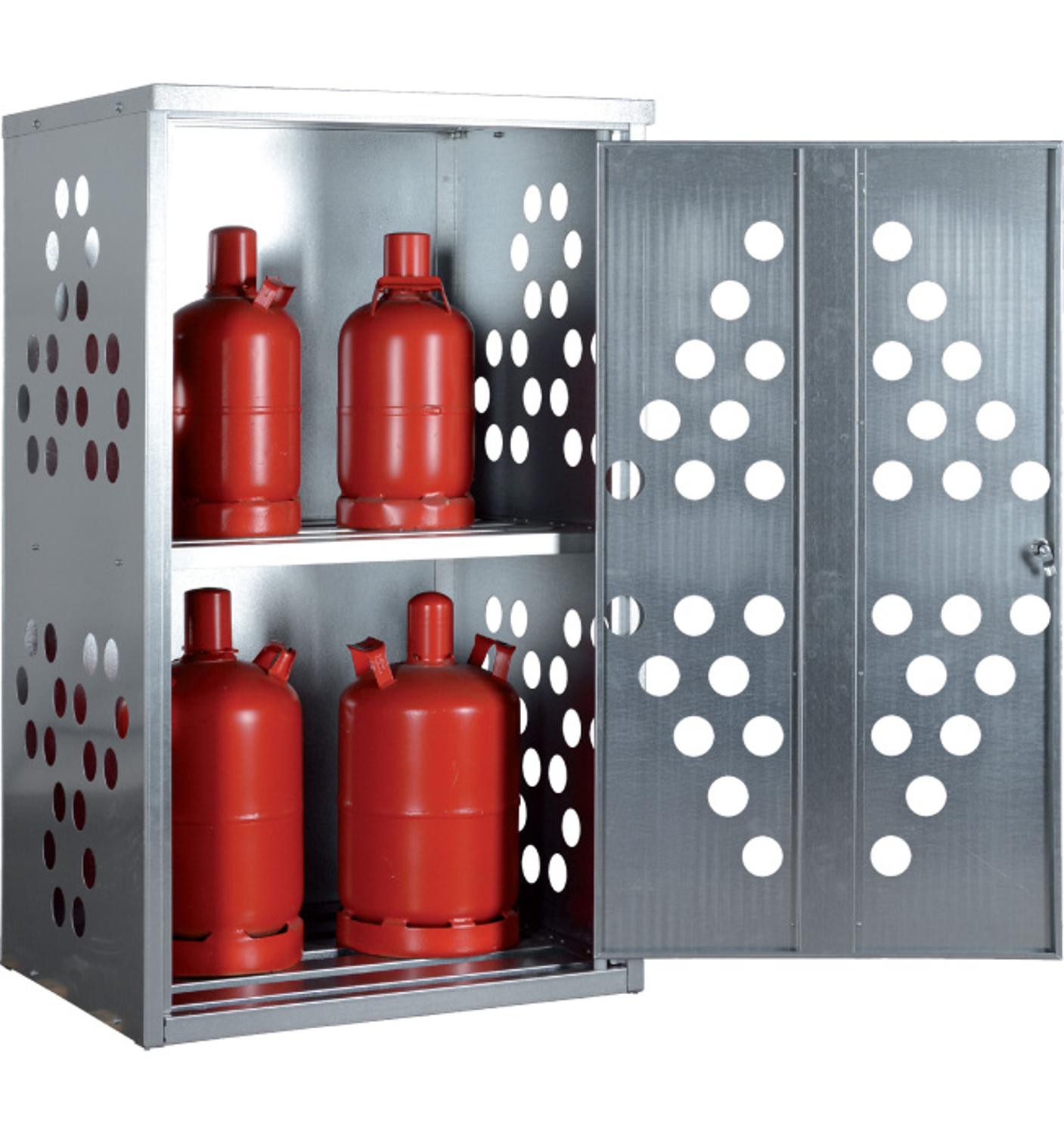 Constructie van verzinkt dik plaatstaal. Ideaal voor de buitenopslag van je propaangasflessen. Dak en achterwand zijn gesloten en een stevige bodem en tussenbodem als opstelvlak. Perforatie in de zijwanden en deur voor de vereiste ventilatie conform PGS 15. De deur is met een cilinderslot af te sluiten voor onbevoegden en voor bescherming tegen diefstal. Voorzien van gevaren pictogram op de deur en wordt gedemonteerd geleverd. Eenvoudige zelfmontage met bijgesloten montagehandleiding.
