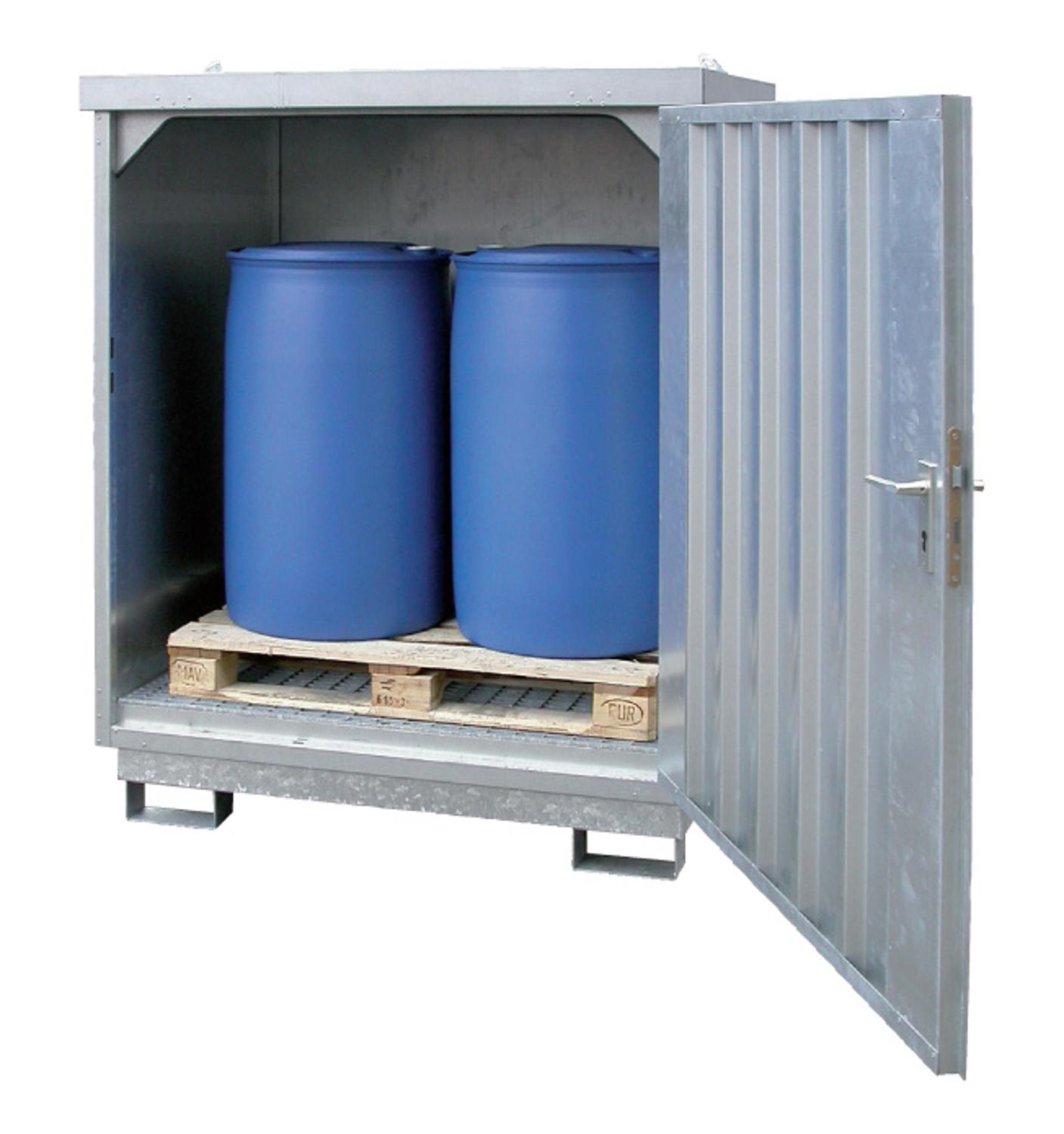 Deze compacte milieucontainer is speciaal ontwikkeld voor de opslag van 2 x 200 liter vaten. Compleet stalen constructie met geprofileerde wand en dak panelen, tevens voorzien van geleidingsschoten langs 3 zijden (m.u.v. deur). Volledig verzinkt voor een lange levensduur.