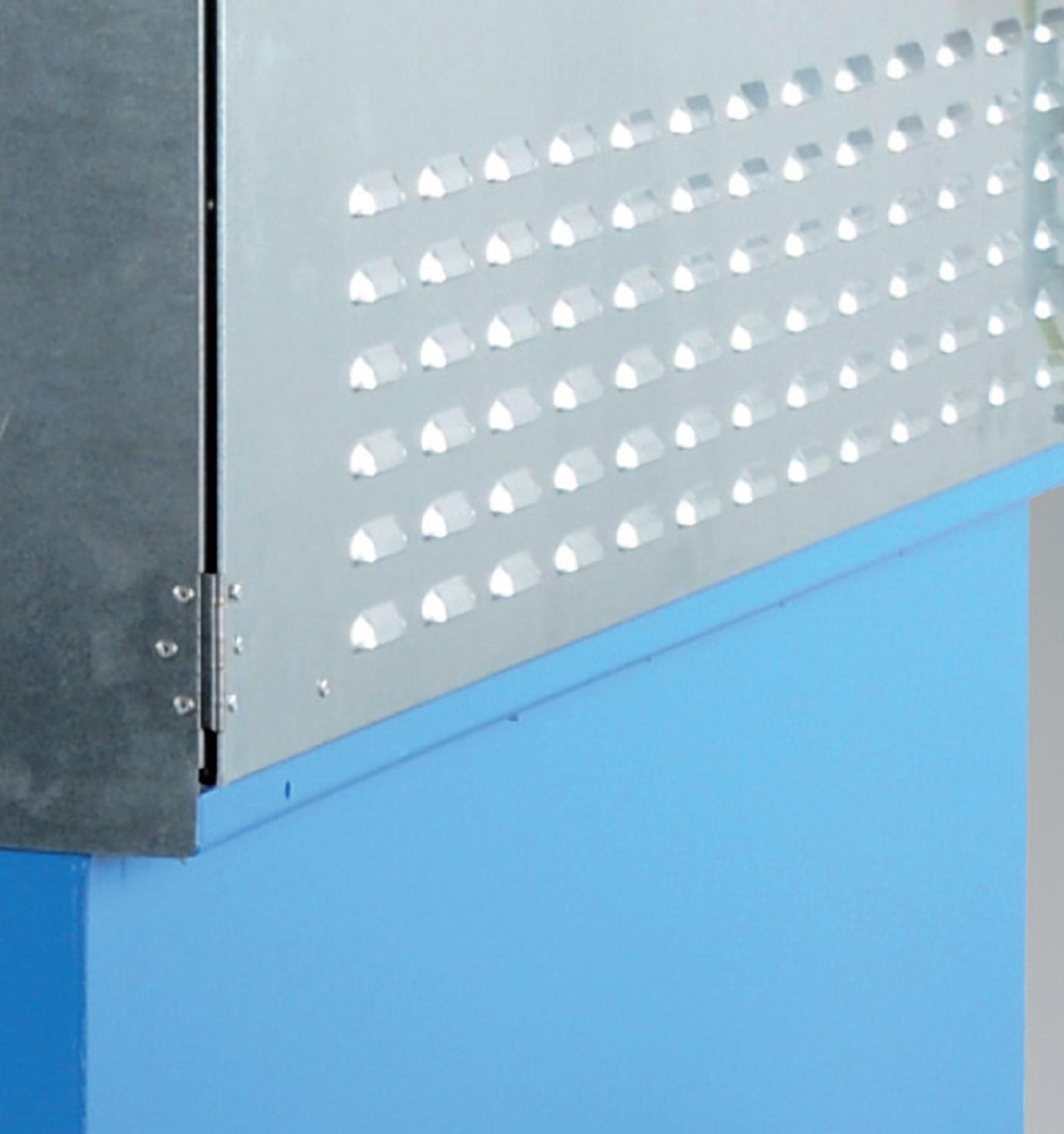 Vloeistofdicht gelaste opvangbak uit 3 mm staalplaat voorzien van uitneembare verzinkte roosters, gelakte uitvoering in RAL 5015. De opvangbak heeft een draagvermogen van 1.500 kg/m² en een bodemvrijheid van 100 mm.