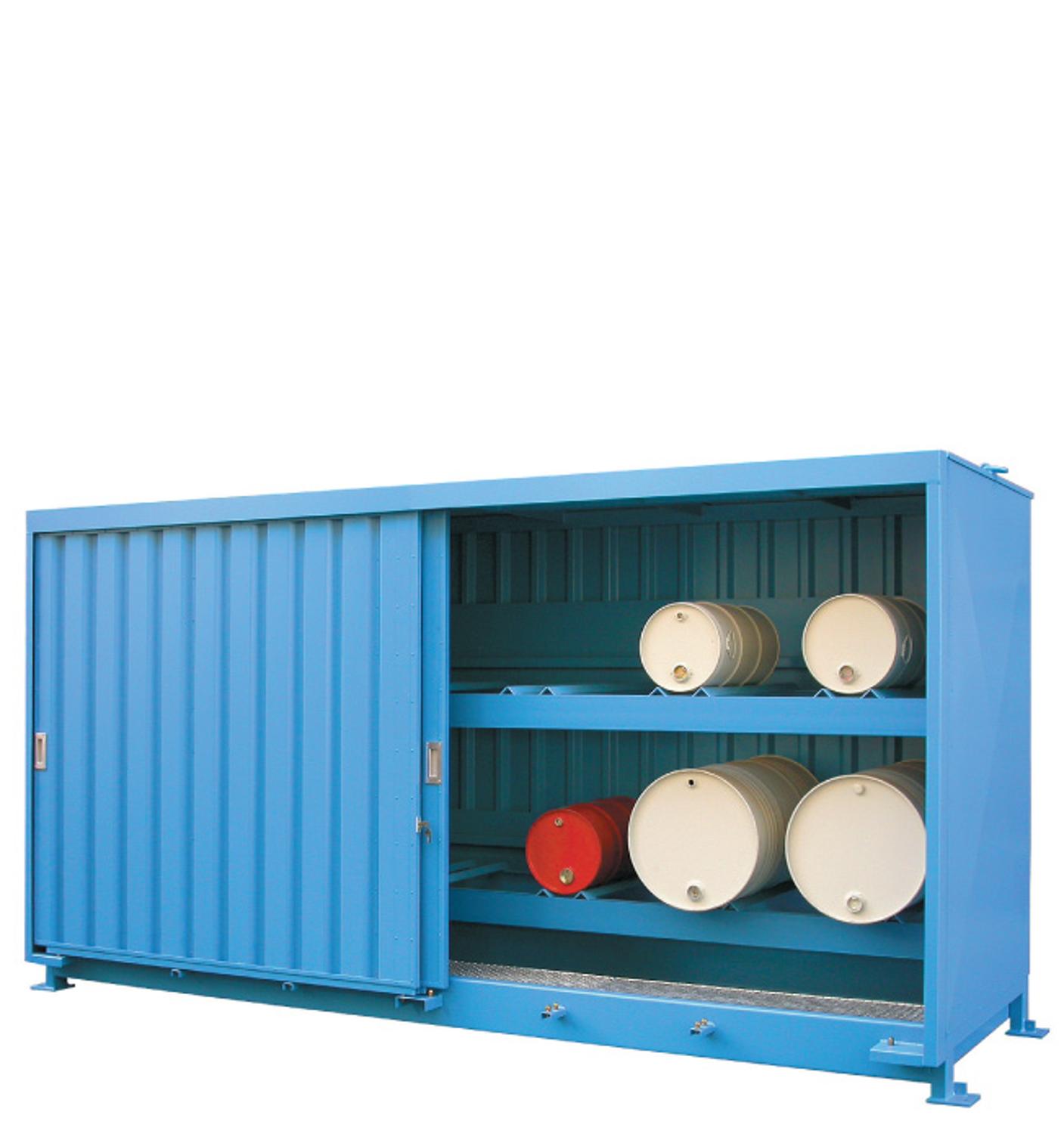 Stalen moduulcontainer is speciaal ontwikkeld voor liggende opslag van stalen 200 liter vaten. De moduulcontainer is opgebouwd uit verzinkt en gecoat trapezium staalplaat, in basis een opvangbak met een frame wat bestaat uit een stabiele raamconstructie van stalen gewalste kokerprofielen en voorzien voetplaten. Compleet met een bodemvrijheid van 60 mm ter voorkoming van corrosie. Standaard is de moduulcontainer tevens voorzien van een aardingspunt. De moduulcontainer wordt volledig gemonteerd geleverd en is direct gereed voor gebruik.