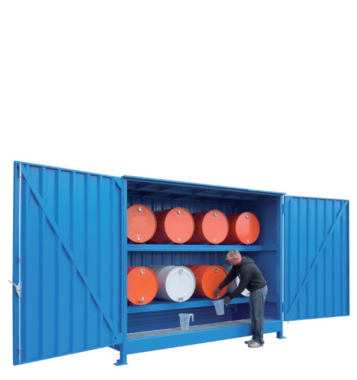 Stalen moduulcontainer is speciaal ontwikkeld voor liggende opslag van stalen 200 liter vaten. De moduulcontainer is opgebouwd uit verzinkt en gecoat trapezium staalplaat, in basis een opvangbak met een frame wat bestaat uit een stabiele raamconstructie van stalen gewalste kokerprofielen en voorzien voetplaten. Compleet met een bodemvrijheid van 60 mm ter voorkoming van corrosie. Standaard is de moduulcontainer tevens voorzien van een aardingspunt. De moduulcontainer wordt volledig gemonteerd geleverd en is direct gereed voor gebruik.