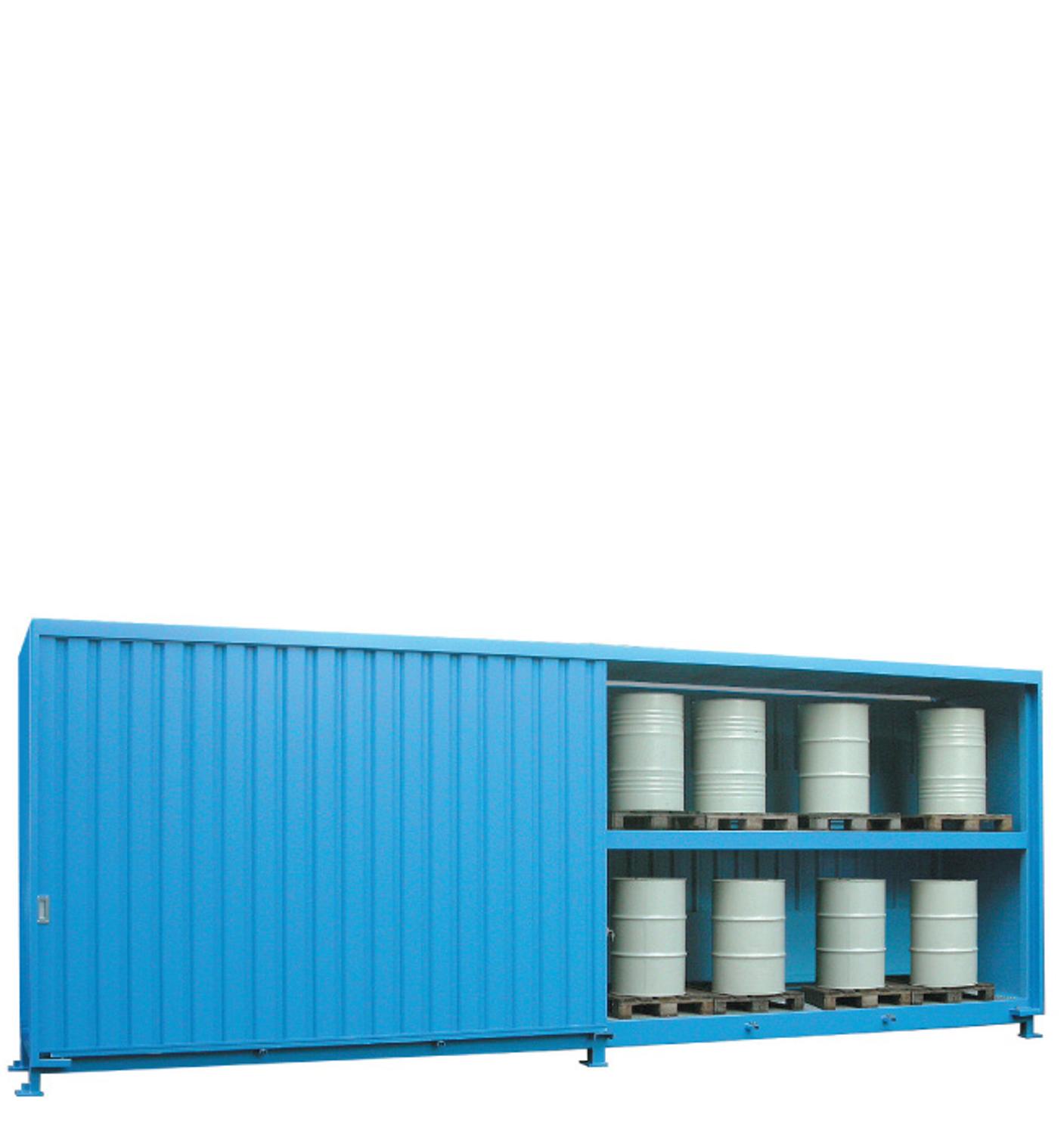 Stalen systeemcontainer speciaal ontwikkeld voor de veilige opslag van gevaarlijke stoffen. De systeemcontainer is opgebouwd uit verzinkt en gecoat staalplaat, in basis een opvangbak met een frame wat bestaat uit een stabiele raamconstructie van stalen gewalste kokerprofielen en is voorzien voetplaten. Compleet met een bodemvrijheid van 60 mm ter voorkoming van corrosie. Standaard is de systeemcontainer tevens voorzien van een aardingspunt. De systeemcontainer wordt volledig gemonteerd geleverd en is direct gereed voor gebruik.