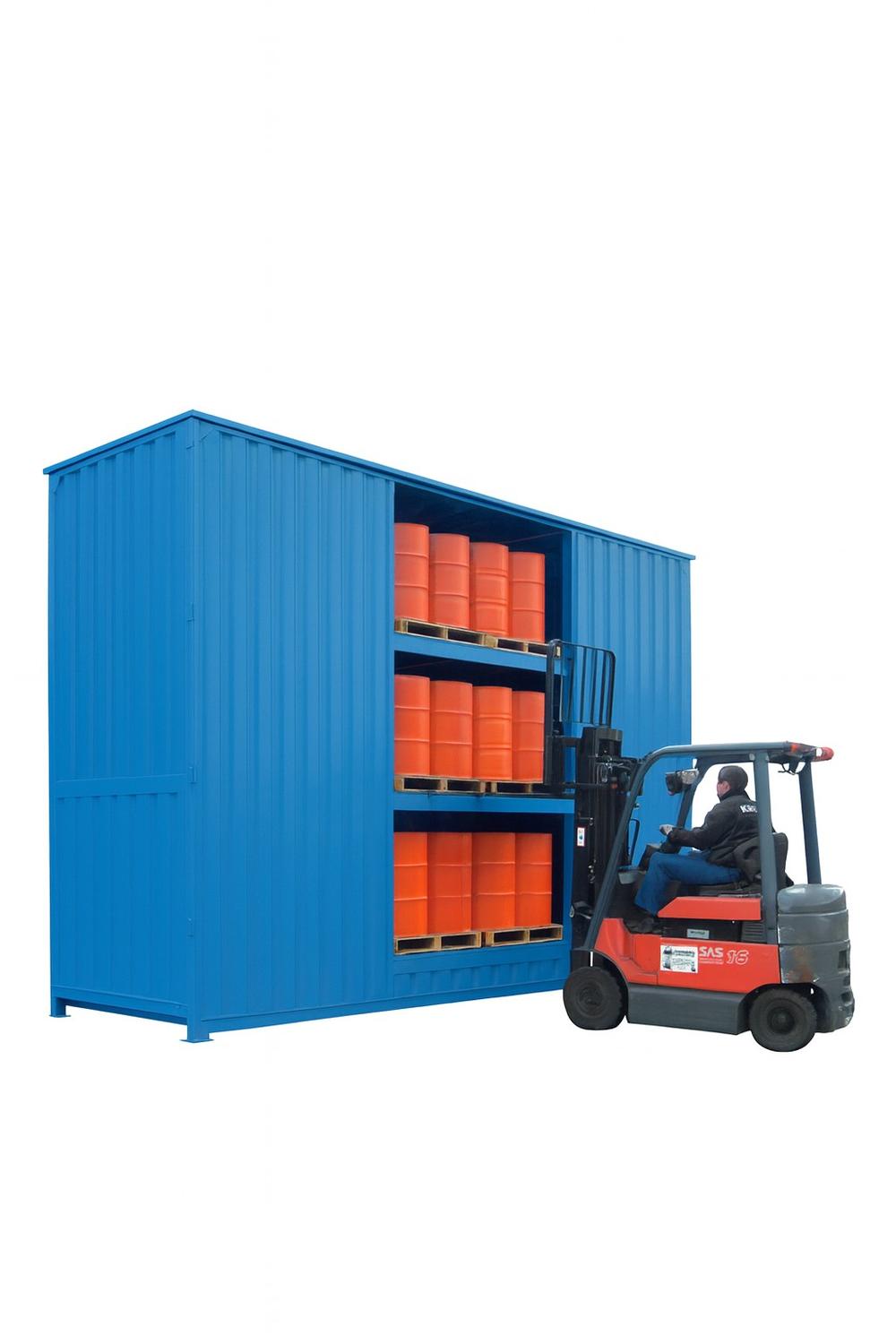 De systeemcontainer is opgebouwd uit verzinkt en gecoat staalplaat. Net als de lekbak geven deze verzinkt stalen wand- en dakprofielen een zeer lange levensduur aan de palletcontainer. Het staal is 3 mm dik en geeft de systeemcontainer een zeer solide afwerking die tegen een stootje kan. De gehele systeemcontainer is afgewerkt met blauwe lak, RAL 5015. Deze laklaag wordt extra aangebracht over de verzinkte buitenzijde. Hiermee is de corrosiebestendigheid van de systeemcontainer vergroot.